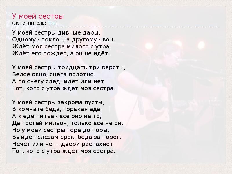 У моей сестры дивные дары: Одному - поклон, а другому - вон. Ждёт моя сестра милого с утра, Ждёт его пождёт, а он не идёт. У моей сестры тридцать три версты, Белое окно, снега полотно. А по снегу след: идет или нет Тот, кого с утра ждет моя сестра. У моей сестры закрома пусты, В комнате беда, горькая еда, А к еде питье - всё оно не то, Да гостей мильон, только всё не он. Но у моей сестры горе до поры, Выйдет слезам срок, беда за порог. Нечет или чет - двери распахнет Тот, кого с утра ждет моя сестра.