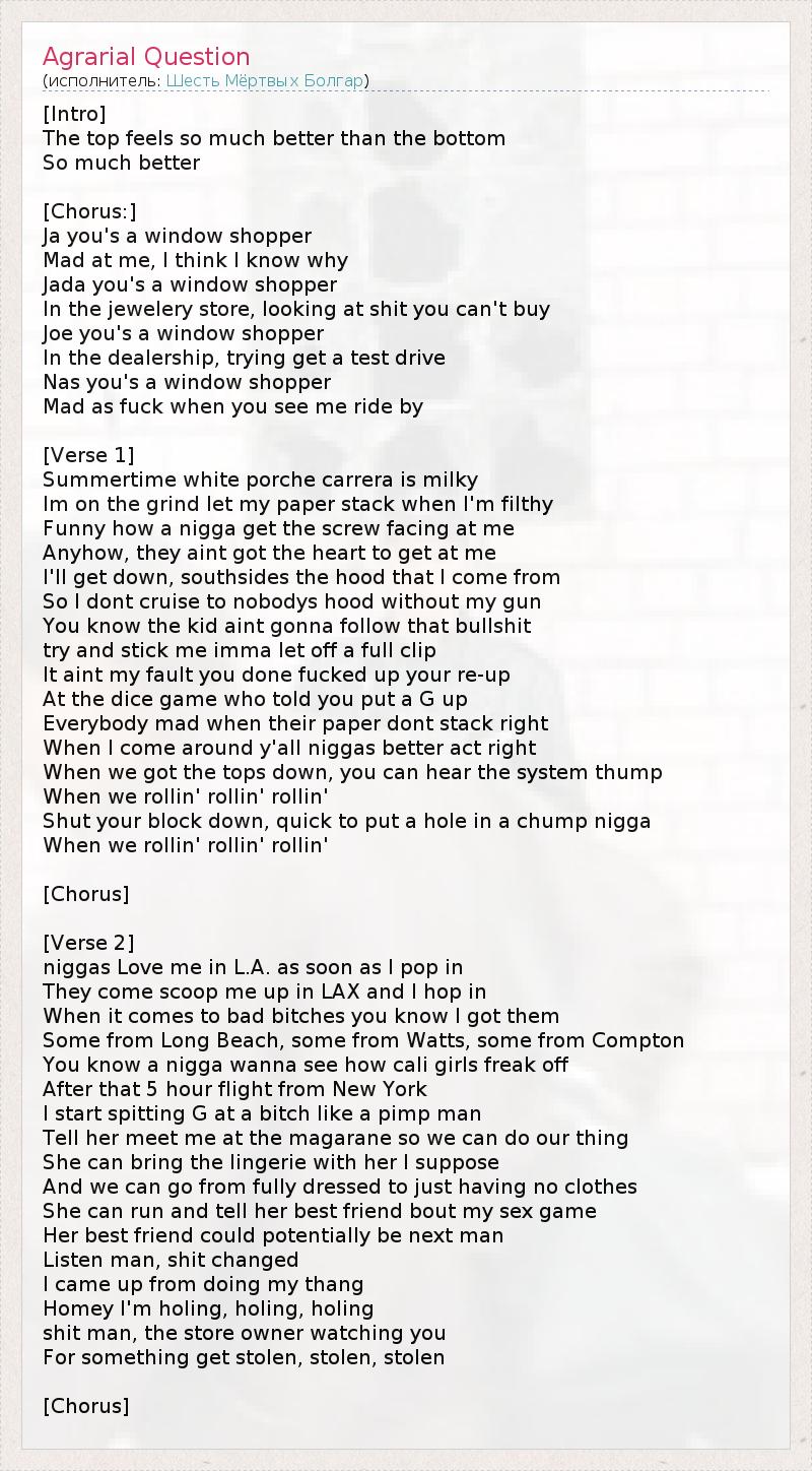 [Пролог] Верхней половине меня гораздо лучше, чем нижней, Гораздо лучше. [Припев:] Джа, ты любишь поглазеть на витрины. Ты сердишься на меня, и я знаю, почему. Джада, ты любишь поглазеть на витрины. В ювелирном ты пялишься на то, что тебе не по карману. Джо, ты любишь поглазеть на витрины. В автосалоне ты мечтаешь о тест-драйве на крутой тачке. Нас, ты любишь поглазеть на витрины, Поэтому тебя колбасит от злости, когда я проезжаю мимо. [1-ый куплет:] Лето. Еду на Порш Каррера молочно-белого цвета. Я работаю - мой кошелёк всё толстеет - я богач. Забавно смотреть на взбешённые морды ниг*ров. Во всяком случае, им не хватит смелости и пальцем меня тронуть. Я вылезаю из машины к югу от того района, где я вырос. К слову, я никуда не езжу без своей пушки. Знаешь, никто не собирается выслушивать эти бредни. Только попробуй, привяжись ко мне, и я выпущу всю обойму. Не я виноват в том, что ты конченый человек, что сидишь на игле. Разве тебя заставляли класть тысячу баксов в игре? Кому по кайфу, когда с деньжатами туговато? Когда я заезжаю к вам, ниг*ры, ведите себя хорошо. Когда верх в машине опущен, из салона доносятся звуки ритма, А мы всё едем и едем. Заткни свою варежку, а то получишь дыру в башку, ниг*р. А мы всё едем и едем. [Припев:] [2-ой куплет:] Ниг*ры в Лос-Анджелесе начинают облизывать меня, как только я появляюсь. Они встречают меня в международном аэропорту, и я запрыгиваю в машину. Затем дело доходит до девочек – в них недостатка я не испытываю. Они и из Лонг Бич, и из Ваттса, и из Комптона. Ниг*ры любят смотреть, как дурачатся тёлки из Калифорнии. После пятичасового перелёта из Нью-Йорка, Мне не жалко потратить целое состояние на девочек. Я говорю одной: «Давай встретимся наедине, чтобы заняться этим». Думаю, она придёт в нижнем белье. Мы начнём полностью одетыми, а закончим, в чём мать родила. Потом она расскажет своему лучшему другу о том, как мы играли в постели, А её лучший друг в последующем станет её мужчиной. Слушай, чел, всё изменилось. Я сделал своё дело. Дружбан, я дырявлю бошки, дырявлю бошки. Чёрт, владелец магазина наблюдает за тобой, Потому что была совершена кража, кража. [Припев:]