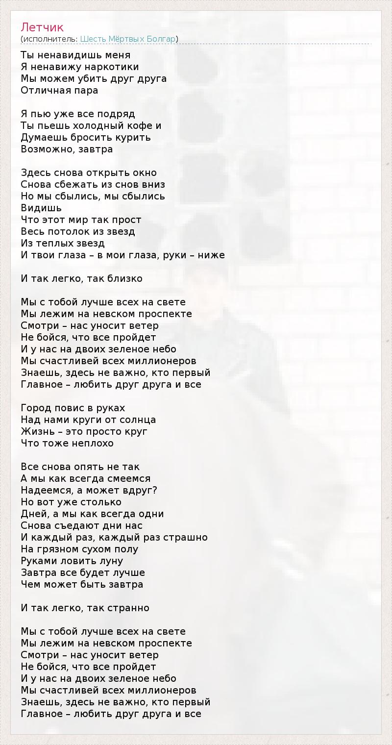 Ты ненавидишь меня Я ненавижу наркотики Мы можем убить друг друга Отличная пара Я пью уже все подряд Ты пьешь холодный кофе и Думаешь бросить курить Возможно, завтра Здесь снова открыть окно Снова сбежать из снов вниз Но мы сбылись, мы сбылись Видишь Что этот мир так прост Весь потолок из звезд Из теплых звезд И твои глаза – в мои глаза, руки – ниже И так легко, так близко Мы с тобой лучше всех на свете Мы лежим на невском проспекте Смотри – нас уносит ветер Не бойся, что все пройдет И у нас на двоих зеленое небо Мы счастливей всех миллионеров Знаешь, здесь не важно, кто первый Главное – любить друг друга и все Город повис в руках Над нами круги от солнца Жизнь – это просто круг Что тоже неплохо Все снова опять не так А мы как всегда смеемся Надеемся, а может вдруг? Но вот уже столько Дней, а мы как всегда одни Снова съедают дни нас И каждый раз, каждый раз страшно На грязном сухом полу Руками ловить луну Завтра все будет лучше Чем может быть завтра И так легко, так странно Мы с тобой лучше всех на свете Мы лежим на невском проспекте Смотри – нас уносит ветер Не бойся, что все пройдет И у нас на двоих зеленое небо Мы счастливей всех миллионеров Знаешь, здесь не важно, кто первый Главное – любить друг друга и все