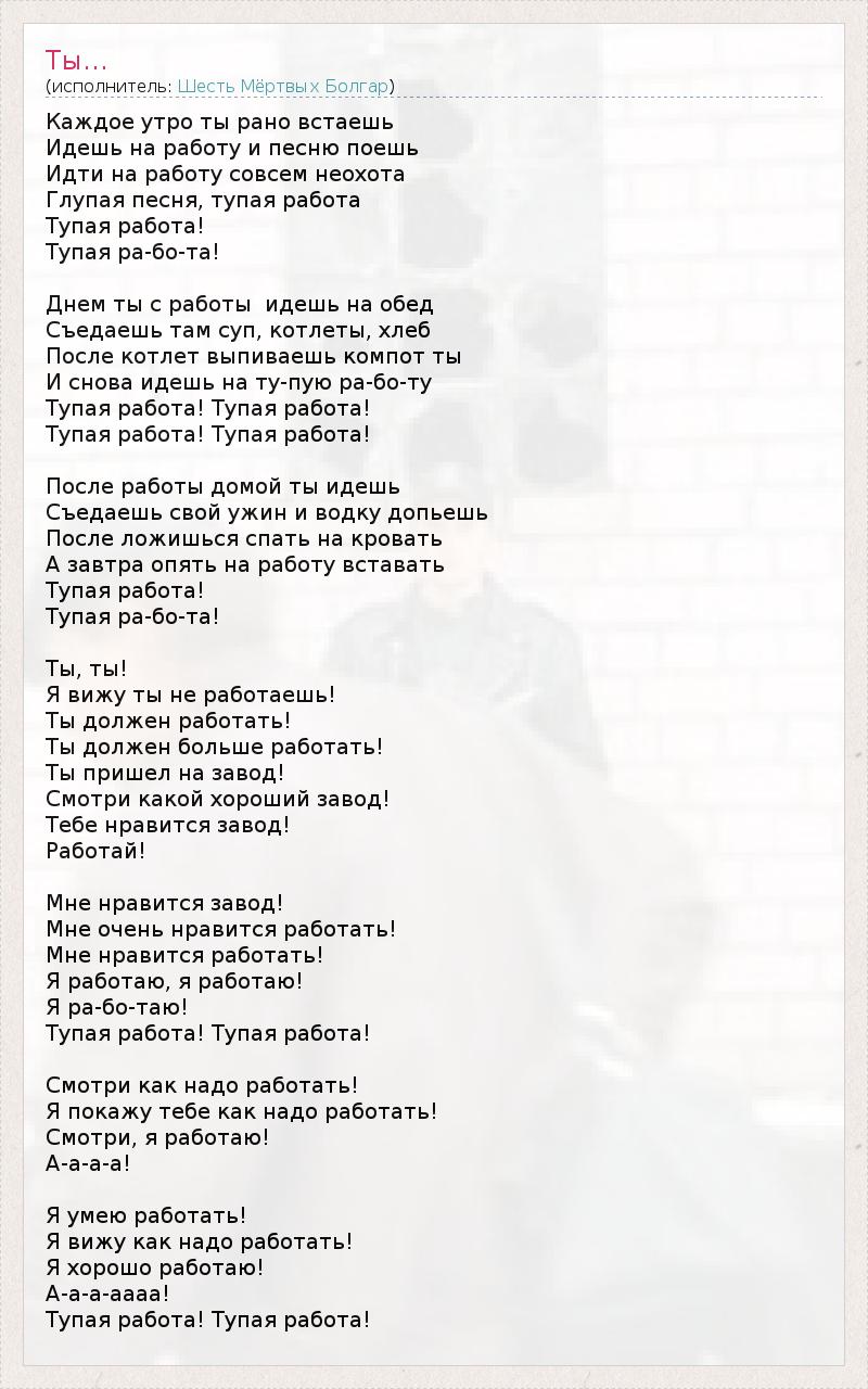 Каждое утро ты рано встаешь Идешь на работу и песню поешь Идти на работу совсем неохота Глупая песня, тупая работа Тупая работа! Тупая ра-бо-та! Днем ты с работы идешь на обед Съедаешь там суп, котлеты, хлеб После котлет выпиваешь компот ты И снова идешь на ту-пую ра-бо-ту Тупая работа! Тупая работа! Тупая работа! Тупая работа! После работы домой ты идешь Съедаешь свой ужин и водку допьешь После ложишься спать на кровать А завтра опять на работу вставать Тупая работа! Тупая ра-бо-та! Ты, ты! Я вижу ты не работаешь! Ты должен работать! Ты должен больше работать! Ты пришел на завод! Смотри какой хороший завод! Тебе нравится завод! Работай! Мне нравится завод! Мне очень нравится работать! Мне нравится работать! Я работаю, я работаю! Я ра-бо-таю! Тупая работа! Тупая работа! Смотри как надо работать! Я покажу тебе как надо работать! Смотри, я работаю! А-а-а-а! Я умею работать! Я вижу как надо работать! Я хорошо работаю! А-а-а-аааа! Тупая работа! Тупая работа!