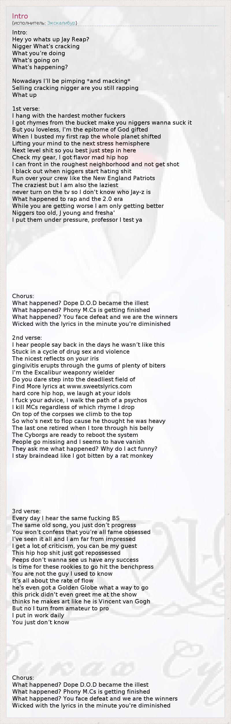 Intro: Hey yo whats up Jay Reap? Nigger What’s cracking What you’re doing What’s going on What’s happening? Nowadays I’ll be pimping *and macking* Selling cracking nigger are you still rapping What up 1st verse: I hang with the hardest mother fuckers I got rhymes from the bucket make you niggers wanna suck it But you loveless, I'm the epitome of God gifted When I busted my first rap the whole planet shifted Lifting your mind to the next stress hemisphere Next level shit so you best just step in here Check my gear, I got flavor mad hip hop I can front in the roughest neighborhood and not get shot I black out when niggers start hating shit Run over your crew like the New England Patriots The craziest but I am also the laziest never turn on the tv so I don't know who Jay-z is What happened to rap and the 2.0 era While you are getting worse I am only getting better Niggers too old, J young and fresha' I put them under pressure, professor I test ya Chorus: What happened? Dope D.O.D became the illest What happened? Phony M.Cs is getting finished What happened? You face defeat and we are the winners Wicked with the lyrics in the minute you're diminished 2nd verse: I hear people say back in the days he wasn’t like this Stuck in a cycle of drug sex and violence The nicest reflects on your iris gingivitis erupts through the gums of plenty of biters I'm the Excalibur weaponry wielder Do you dare step into the deadliest field of Find More lyrics at www.sweetslyrics.com hard core hip hop, we laugh at your idols I fuck your advice, I walk the path of a psychos I kill MCs regardless of which rhyme I drop On top of the corpses we climb to the top So who's next to flop cause he thought he was heavy The last one retired when I tore through his belly The Cyborgs are ready to reboot the system People go missing and I seems to have vanish They ask me what happened? Why do I act funny? I stay braindead like I got bitten by a rat monkey 3rd verse: Every day I hear the same fucking BS The same old song, you just don’t progress You won’t confess that you’re all fame obsessed I’ve seen it all and I am far from impressed I get a lot of criticism, you can be my guest This hip hop shit just got repossessed Peeps don’t wanna see us have any success Is time for these rookies to go hit the benchpress You are not the guy I used to know It’s all about the rate of flow he's even got a Golden Globe what a way to go this prick didn't even greet me at the show thinks he makes art like he is Vincent van Gogh But no I turn from amateur to pro I put in work daily You just don’t know Chorus: What happened? Dope D.O.D became the illest What happened? Phony M.Cs is getting finished What happened? You face defeat and we are the winners Wicked with the lyrics in the minute you're diminished