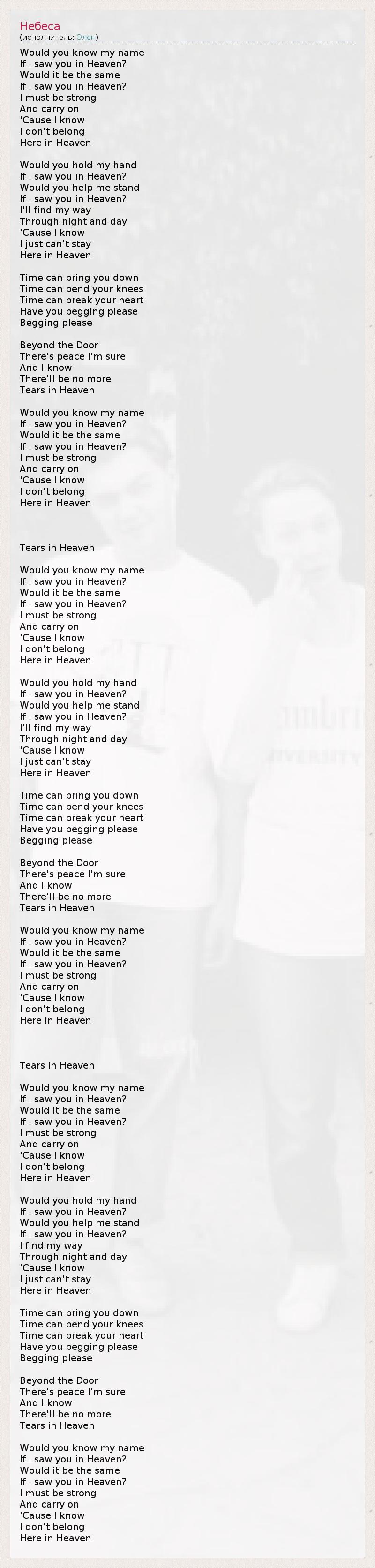 Would you know my name If I saw you in Heaven? Would it be the same If I saw you in Heaven? I must be strong And carry on 'Cause I know I don't belong Here in Heaven Would you hold my hand If I saw you in Heaven? Would you help me stand If I saw you in Heaven? I'll find my way Through night and day 'Cause I know I just can't stay Here in Heaven Time can bring you down Time can bend your knees Time can break your heart Have you begging please Begging please Beyond the Door There's peace I'm sure And I know There'll be no more Tears in Heaven Would you know my name If I saw you in Heaven? Would it be the same If I saw you in Heaven? I must be strong And carry on 'Cause I know I don't belong Here in Heaven Tears in Heaven Would you know my name If I saw you in Heaven? Would it be the same If I saw you in Heaven? I must be strong And carry on 'Cause I know I don't belong Here in Heaven Would you hold my hand If I saw you in Heaven? Would you help me stand If I saw you in Heaven? I'll find my way Through night and day 'Cause I know I just can't stay Here in Heaven Time can bring you down Time can bend your knees Time can break your heart Have you begging please Begging please Beyond the Door There's peace I'm sure And I know There'll be no more Tears in Heaven Would you know my name If I saw you in Heaven? Would it be the same If I saw you in Heaven? I must be strong And carry on 'Cause I know I don't belong Here in Heaven Tears in Heaven Would you know my name If I saw you in Heaven? Would it be the same If I saw you in Heaven? I must be strong And carry on 'Cause I know I don't belong Here in Heaven Would you hold my hand If I saw you in Heaven? Would you help me stand If I saw you in Heaven? I find my way Through night and day 'Cause I know I just can't stay Here in Heaven Time can bring you down Time can bend your knees Time can break your heart Have you begging please Begging please Beyond the Door There's peace I'm sure And I know There'll be no more Tears in Heaven Would you know my name If I saw you in Heaven? Would it be the same If I saw you in Heaven? I must be strong And carry on 'Cause I know I don't belong Here in Heaven