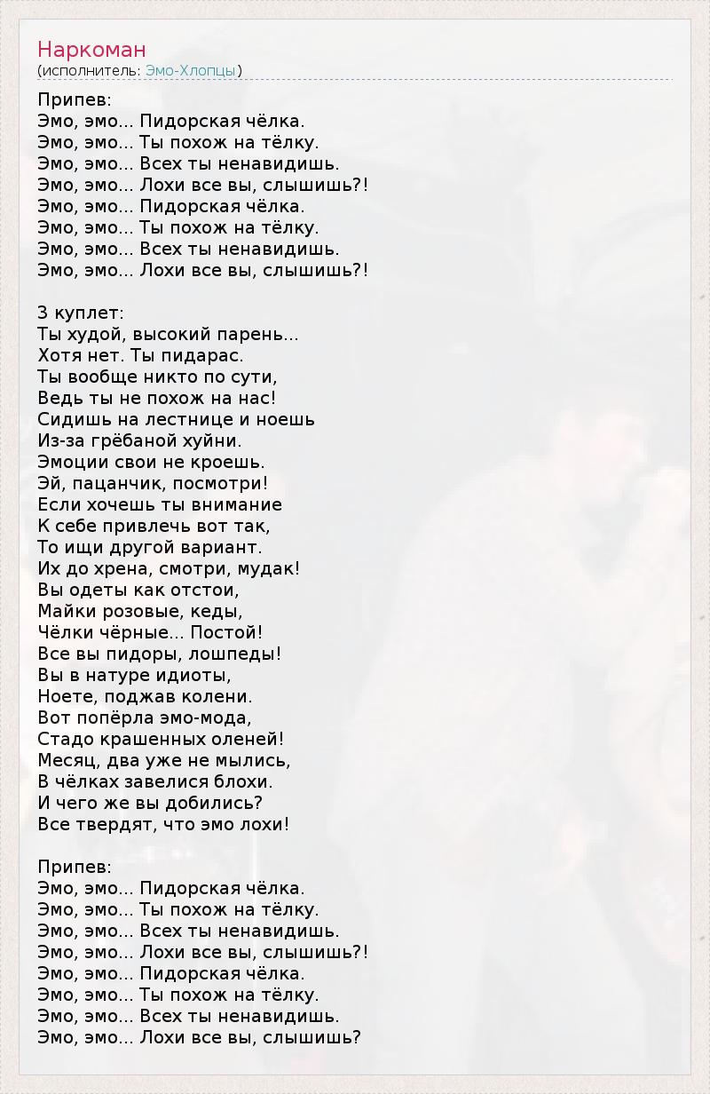 Припев: Эмо, эмо... Пидорская чёлка. Эмо, эмо... Ты похож на тёлку. Эмо, эмо... Всех ты ненавидишь. Эмо, эмо... Лохи все вы, слышишь?! Эмо, эмо... Пидорская чёлка. Эмо, эмо... Ты похож на тёлку. Эмо, эмо... Всех ты ненавидишь. Эмо, эмо... Лохи все вы, слышишь?! 3 куплет: Ты худой, высокий парень... Хотя нет. Ты пидарас. Ты вообще никто по сути, Ведь ты не похож на нас! Сидишь на лестнице и ноешь Из-за грёбаной хуйни. Эмоции свои не кроешь. Эй, пацанчик, посмотри! Если хочешь ты внимание К себе привлечь вот так, То ищи другой вариант. Их до хрена, смотри, мудак! Вы одеты как отстои, Майки розовые, кеды, Чёлки чёрные... Постой! Все вы пидоры, лошпеды! Вы в натуре идиоты, Ноете, поджав колени. Вот попёрла эмо-мода, Стадо крашенных оленей! Месяц, два уже не мылись, В чёлках завелися блохи. И чего же вы добились? Все твердят, что эмо лохи! Припев: Эмо, эмо... Пидорская чёлка. Эмо, эмо... Ты похож на тёлку. Эмо, эмо... Всех ты ненавидишь. Эмо, эмо... Лохи все вы, слышишь?! Эмо, эмо... Пидорская чёлка. Эмо, эмо... Ты похож на тёлку. Эмо, эмо... Всех ты ненавидишь. Эмо, эмо... Лохи все вы, слышишь?