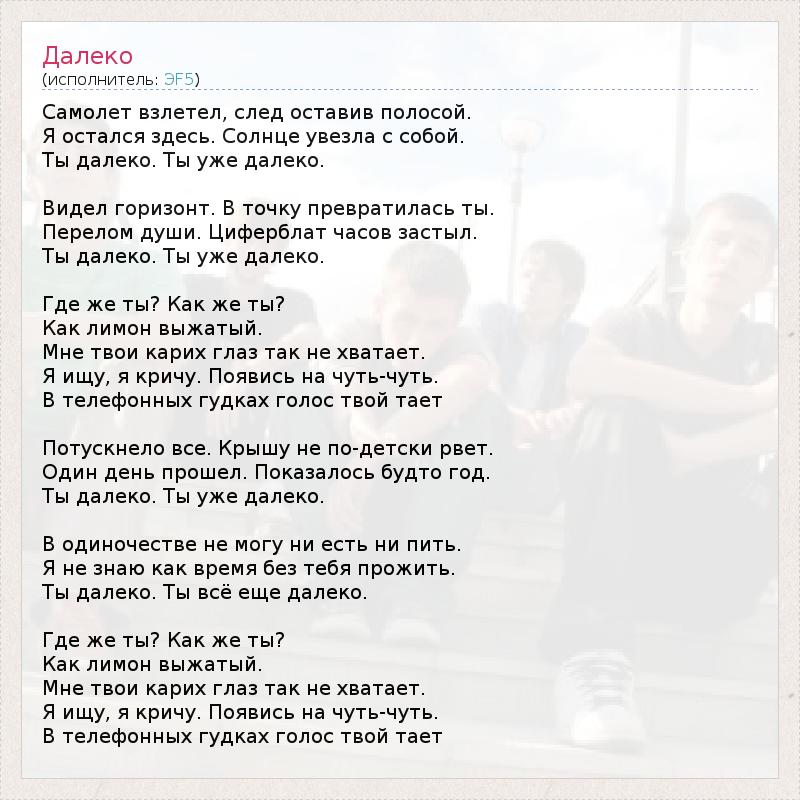 Самолет взлетел, след оставив полосой. Я остался здесь. Солнце увезла с собой. Ты далеко. Ты уже далеко. Видел горизонт. В точку превратилась ты. Перелом души. Циферблат часов застыл. Ты далеко. Ты уже далеко. Где же ты? Как же ты? Как лимон выжатый. Мне твои карих глаз так не хватает. Я ищу, я кричу. Появись на чуть-чуть. В телефонных гудках голос твой тает Потускнело все. Крышу не по-детски рвет. Один день прошел. Показалось будто год. Ты далеко. Ты уже далеко. В одиночестве не могу ни есть ни пить. Я не знаю как время без тебя прожить. Ты далеко. Ты всё еще далеко. Где же ты? Как же ты? Как лимон выжатый. Мне твои карих глаз так не хватает. Я ищу, я кричу. Появись на чуть-чуть. В телефонных гудках голос твой тает