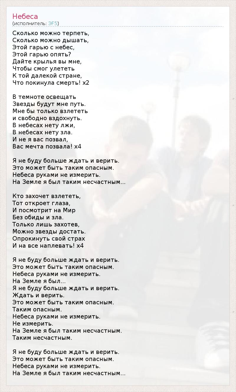 Сколько можно терпеть, Сколько можно дышать, Этой гарью с небес, Этой гарью опять? Дайте крылья вы мне, Чтобы смог улететь К той далекой стране, Что покинула смерть! х2 В темноте освещать Звезды будут мне путь. Мне бы только взлететь и свободно вздохнуть. В небесах нету лжи, В небесах нету зла. И не я вас позвал, Вас мечта позвала! х4 Я не буду больше ждать и верить. Это может быть таким опасным. Небеса руками не измерить. На Земле я был таким несчастным... Кто захочет взлететь, Тот откроет глаза, И посмотрит на Мир Без обиды и зла. Только лишь захотев, Можно звезды достать. Опрокинуть свой страх И на все наплевать! х4 Я не буду больше ждать и верить. Это может быть таким опасным. Небеса руками не измерить. На Земле я был... Я не буду больше ждать и верить. Ждать и верить. Это может быть таким опасным. Таким опасным. Небеса руками не измерить. Не измерить. На Земле я был таким несчастным. Таким несчастным. Я не буду больше ждать и верить. Это может быть таким опасным. Небеса руками не измерить. На Земле я был таким несчастным...