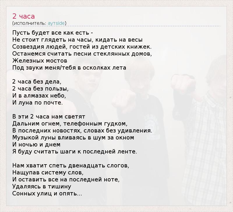 Пусть будет все как есть - Не стоит глядеть на часы, кидать на весы Созвездия людей, гостей из детских книжек. Останемся считать песни стеклянных домов, Железных мостов Под звуки меня/тебя в осколках лета 2 часа без дела, 2 часа без пользы, И в алмазах небо, И луна по почте. В эти 2 часа нам светят Дальним огнем, телефонным гудком, В последних новостях, словах без удивления. Музыкой луны вливаясь в шум за окном И ночью и днем Я буду считать шаги к последней ленте. Нам хватит спеть двенадцать слогов, Нащупав систему слов, И оставить все на последней ноте, Удаляясь в тишину Сонных улиц и опять...