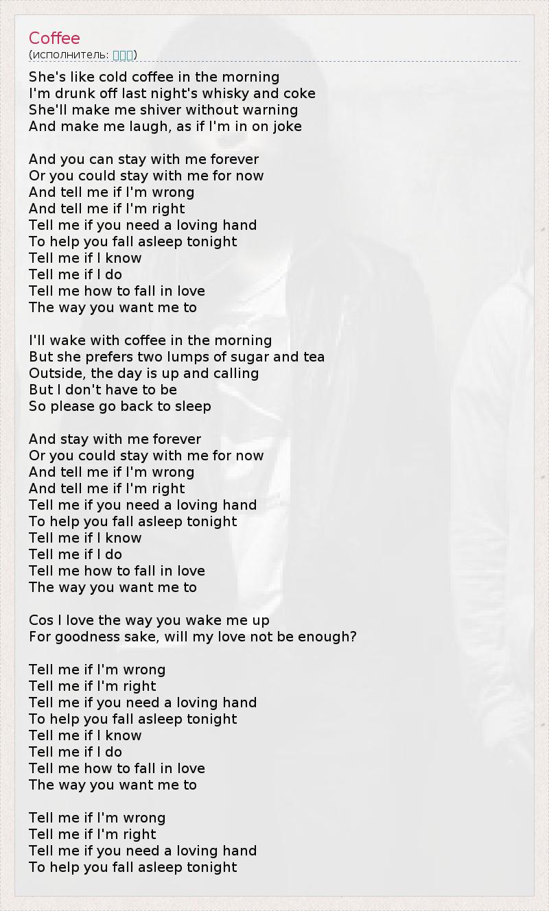She's like cold coffee in the morning I'm drunk off last night's whisky and coke She'll make me shiver without warning And make me laugh, as if I'm in on joke And you can stay with me forever Or you could stay with me for now And tell me if I'm wrong And tell me if I'm right Tell me if you need a loving hand To help you fall asleep tonight Tell me if I know Tell me if I do Tell me how to fall in love The way you want me to I'll wake with coffee in the morning But she prefers two lumps of sugar and tea Outside, the day is up and calling But I don't have to be So please go back to sleep And stay with me forever Or you could stay with me for now And tell me if I'm wrong And tell me if I'm right Tell me if you need a loving hand To help you fall asleep tonight Tell me if I know Tell me if I do Tell me how to fall in love The way you want me to Cos I love the way you wake me up For goodness sake, will my love not be enough? Tell me if I'm wrong Tell me if I'm right Tell me if you need a loving hand To help you fall asleep tonight Tell me if I know Tell me if I do Tell me how to fall in love The way you want me to Tell me if I'm wrong Tell me if I'm right Tell me if you need a loving hand To help you fall asleep tonight