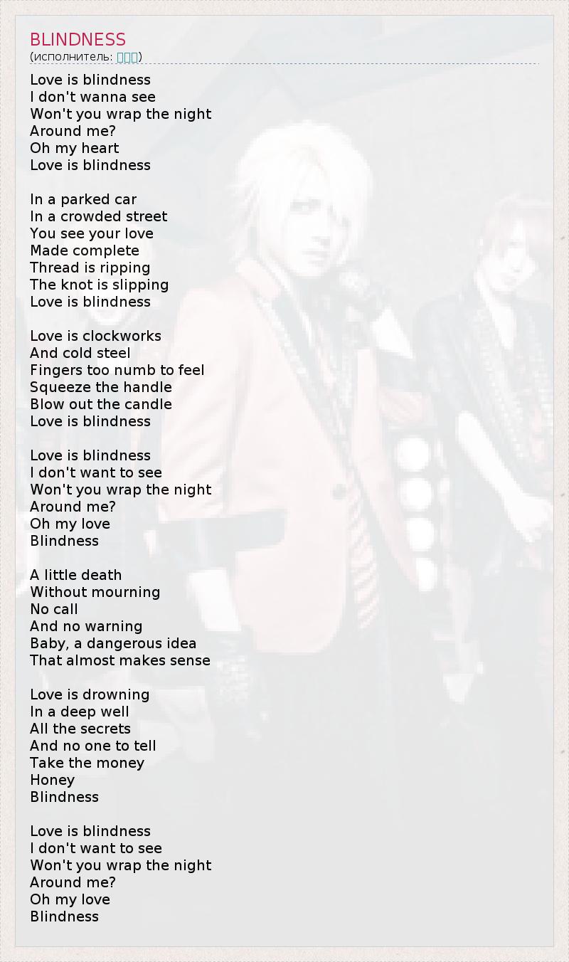 Love is blindness I don't wanna see Won't you wrap the night Around me? Oh my heart Love is blindness In a parked car In a crowded street You see your love Made complete Thread is ripping The knot is slipping Love is blindness Love is clockworks And cold steel Fingers too numb to feel Squeeze the handle Blow out the candle Love is blindness Love is blindness I don't want to see Won't you wrap the night Around me? Oh my love Blindness A little death Without mourning No call And no warning Baby, a dangerous idea That almost makes sense Love is drowning In a deep well All the secrets And no one to tell Take the money Honey Blindness Love is blindness I don't want to see Won't you wrap the night Around me? Oh my love Blindness