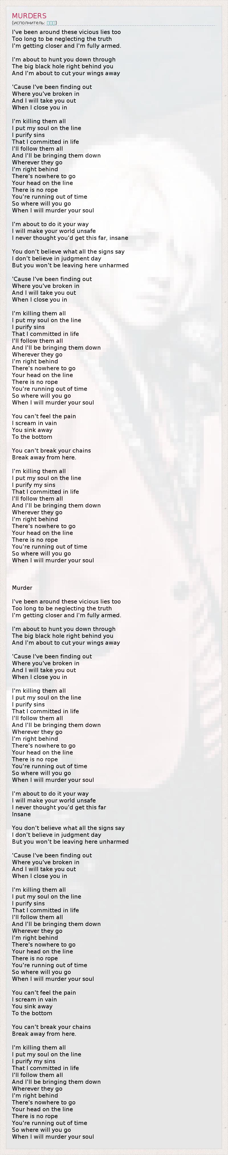 Я тоже искушена в жестокой лжи, Слишком долго отрицала правду, Я приближаюсь – и я во всеоружии. Я выслежу тебя сегодня Из темноты, что прямо за тобой, И я подрежу твои крылья... Ведь я искала место, В которое ты ворвался без предупреждений, И я сведу с тобою счёты, Как только подберусь поближе. Я убиваю их всех! Моя душа на кону, Я очищаю грехи, Которые совершила. Я настигну их всех И отниму у них жизнь! Куда бы они ни пошли, Я стану их тенью. Спасения нет! Твоя жизнь на кону, И не за что ухватиться, Твои дни сочтены. Куда же ты денешься, Когда я убью твою душу?.. Я собираюсь поступить по-твоему, Я лишу твой мир спокойствия, Я никогда не думала, что ты зайдёшь так далеко, безумец. Ты не веришь приметам, А я не верю в судный день, Но ты не уйдёшь отсюда целым. Ведь я искала место, В которое ты ворвался без предупреждений, И я сведу с тобою счёты, Как только подберусь поближе. Я убиваю их всех! Моя душа на кону, Я очищаю грехи, Которые совершила. Я настигну их всех И отниму у них жизнь! Куда бы они ни пошли, Я стану их тенью. Спасения нет! Твоя жизнь на кону, И не за что ухватиться, Твои дни сочтены. Куда же ты денешься, Когда я убью твою душу?.. Ты не чувствуешь боли, Мои крики напрасны, Ты тонешь, Опускаешься на дно... Тебе не разорвать цепей, Не вырваться отсюда!.. Я убиваю их всех! Моя душа на кону, Я очищаю грехи, Которые совершила. Я настигну их всех И отниму у них жизни! Куда бы они ни пошли, Я стану их тенью. Спасения нет! Твоя жизнь на кону, И не за что ухватиться, Твои дни сочтены. Куда же ты денешься, Когда я убью твою душу?.. Убийство (перевод pravda из Хабаровска) Я была в этом порочном круге лжи Слишком долго, чтобы игнорировать правду. Я приближаюсь и я полностью вооружена. Я собираюсь выследить тебя через Большую черную дыру, что рядом с тобой. И я отрежу тебе крылья. Потому что я поняла, Где ты надломился. И я заберу тебя с собой, Как только приближусь. Я убью их всех, Рискуя душой. Я очищусь от грехов, Что совершила. Я буду преследовать их всех, И я их сломаю. Куда бы они ни отправились, Я буду сзади. Некуда идти, Твоя голова на кону. Нет веревки, Время истекает. Так куда же ты пойдешь, Когда я убью твою душу? Я собираюсь сделать это по-твоему, Я сделаю твой мир небезопасным. Никогда не думала, что ты заразишься Этим безумием. Ты не веришь знакам, Я не верю в Судный День. Но ты не уйдешь отсюда невредимым. Потому что я поняла, Где ты надломился. И я заберу тебя с собой, Как только приближусь. Я убью их всех, Рискуя душой. Я очищусь от грехов, Что совершила. Я буду преследовать их всех, И я их сломаю. Куда бы они ни отправились, Я буду сзади. Некуда идти, Твоя голова на кону. Нет веревки, Время истекает. Так куда же ты пойдешь, Когда я убью твою душу? Ты не чувствуешь боли. Я напрасно кричу. Ты погружаешься Ко дну. Ты не можешь сломать цепи И вырваться отсюда. Я убью их всех, Рискуя душой. Я очищусь от грехов, Что совершила. Я буду преследовать их всех, И я их сломаю. Куда бы они не отправились, Я буду сзади. Некуда идти, Твоя голова на кону. Нет веревки, Время истекает. Так куда же ты пойдешь, Когда я убью твою душу?