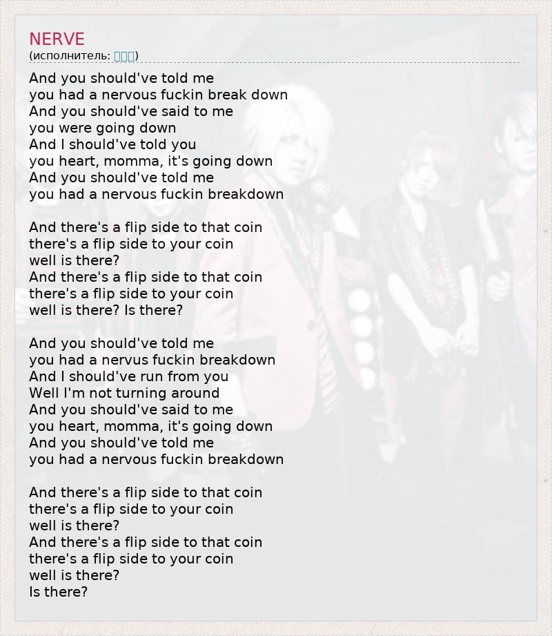 And you should've told me you had a nervous fuckin break down And you should've said to me you were going down And I should've told you you heart, momma, it's going down And you should've told me you had a nervous fuckin breakdown And there's a flip side to that coin there's a flip side to your coin well is there? And there's a flip side to that coin there's a flip side to your coin well is there? Is there? And you should've told me you had a nervus fuckin breakdown And I should've run from you Well I'm not turning around And you should've said to me you heart, momma, it's going down And you should've told me you had a nervous fuckin breakdown And there's a flip side to that coin there's a flip side to your coin well is there? And there's a flip side to that coin there's a flip side to your coin well is there? Is there?