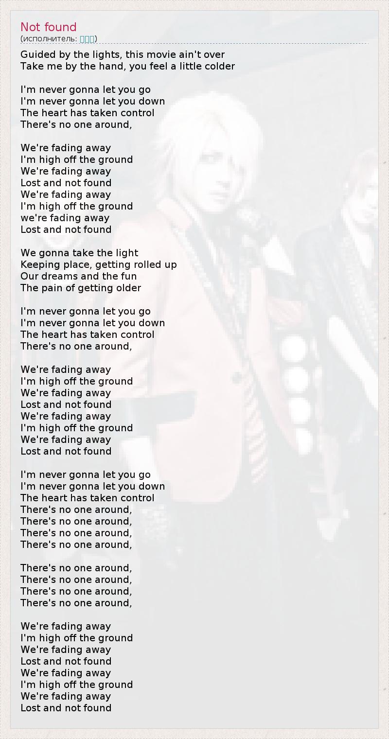 Guided by the lights, this movie ain't over Take me by the hand, you feel a little colder I'm never gonna let you go I'm never gonna let you down The heart has taken control There's no one around, We're fading away I'm high off the ground We're fading away Lost and not found We're fading away I'm high off the ground we're fading away Lost and not found We gonna take the light Keeping place, getting rolled up Our dreams and the fun The pain of getting older I'm never gonna let you go I'm never gonna let you down The heart has taken control There's no one around, We're fading away I'm high off the ground We're fading away Lost and not found We're fading away I'm high off the ground We're fading away Lost and not found I'm never gonna let you go I'm never gonna let you down The heart has taken control There's no one around, There's no one around, There's no one around, There's no one around, There's no one around, There's no one around, There's no one around, There's no one around, We're fading away I'm high off the ground We're fading away Lost and not found We're fading away I'm high off the ground We're fading away Lost and not found
