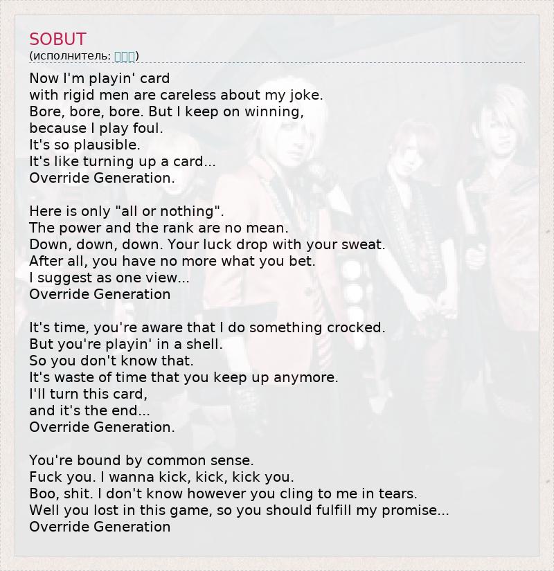 Now I'm playin' card with rigid men are careless about my joke. Bore, bore, bore. But I keep on winning, because I play foul. It's so plausible. It's like turning up a card... Override Generation. Here is only "all or nothing". The power and the rank are no mean. Down, down, down. Your luck drop with your sweat. After all, you have no more what you bet. I suggest as one view... Override Generation It's time, you're aware that I do something crocked. But you're playin' in a shell. So you don't know that. It's waste of time that you keep up anymore. I'll turn this card, and it's the end... Override Generation. You're bound by common sense. Fuck you. I wanna kick, kick, kick you. Boo, shit. I don't know however you cling to me in tears. Well you lost in this game, so you should fulfill my promise... Override Generation