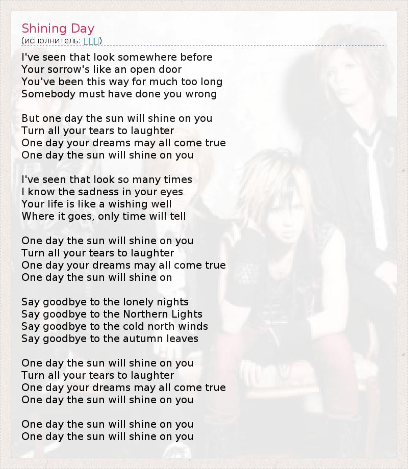 Я видел это когда-то раньше: Твоя печаль подобна незапертой двери. Ты шла по этому пути слишком долго, Кто-то должен сказать, что ты заблуждаешься... Но наступит день, когда солнце засияет для тебя, И твои слезы превратятся в смех. Однажды все твои мечты станут реальностью, Однажды солнце засияет для тебя... Я видел этот взгляд много раз, Я чувствую печаль в твоих глазах. Твоя жизнь как колодец, у которого загадывают желания, Куда она тебя приведёт - покажет только время... Однажды солнце засияет для тебя, И твои слезы превратятся в смех . Однажды все твои мечты станут реальностью, Однажды солнце засияет для тебя... Скажи "Прощай!" одиноким ночам, Скажи "Прощай!" северному сиянию, Скажи "Прощай!" холодному северному ветру, Скажи "Прощай!" осенним листьям.... Однажды солнце засияет для тебя, И твои слезы превратятся в смех . Однажды все твои мечты станут реальностью, Однажды солнце засияет для тебя... Однажды солнце засияет для тебя, Однажды солнце засияет для тебя...