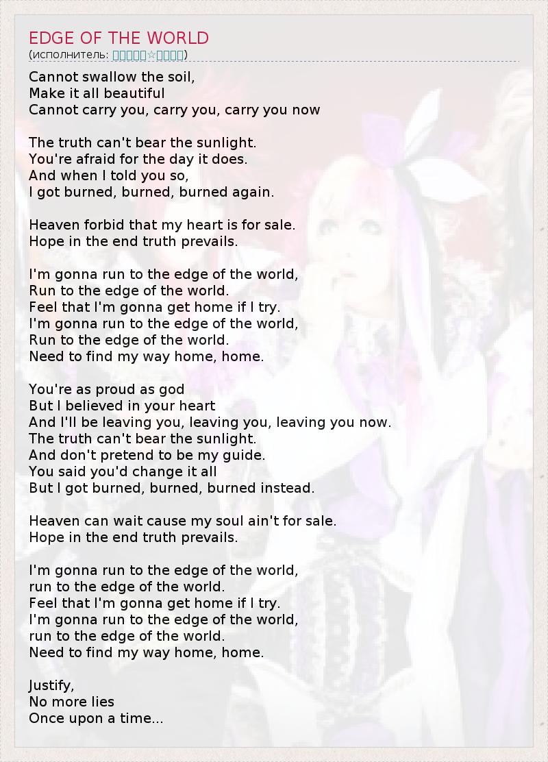 Cannot swallow the soil, Make it all beautiful Cannot carry you, carry you, carry you now The truth can't bear the sunlight. You're afraid for the day it does. And when I told you so, I got burned, burned, burned again. Heaven forbid that my heart is for sale. Hope in the end truth prevails. I'm gonna run to the edge of the world, Run to the edge of the world. Feel that I'm gonna get home if I try. I'm gonna run to the edge of the world, Run to the edge of the world. Need to find my way home, home. You're as proud as god But I believed in your heart And I'll be leaving you, leaving you, leaving you now. The truth can't bear the sunlight. And don't pretend to be my guide. You said you'd change it all But I got burned, burned, burned instead. Heaven can wait cause my soul ain't for sale. Hope in the end truth prevails. I'm gonna run to the edge of the world, run to the edge of the world. Feel that I'm gonna get home if I try. I'm gonna run to the edge of the world, run to the edge of the world. Need to find my way home, home. Justify, No more lies Once upon a time...