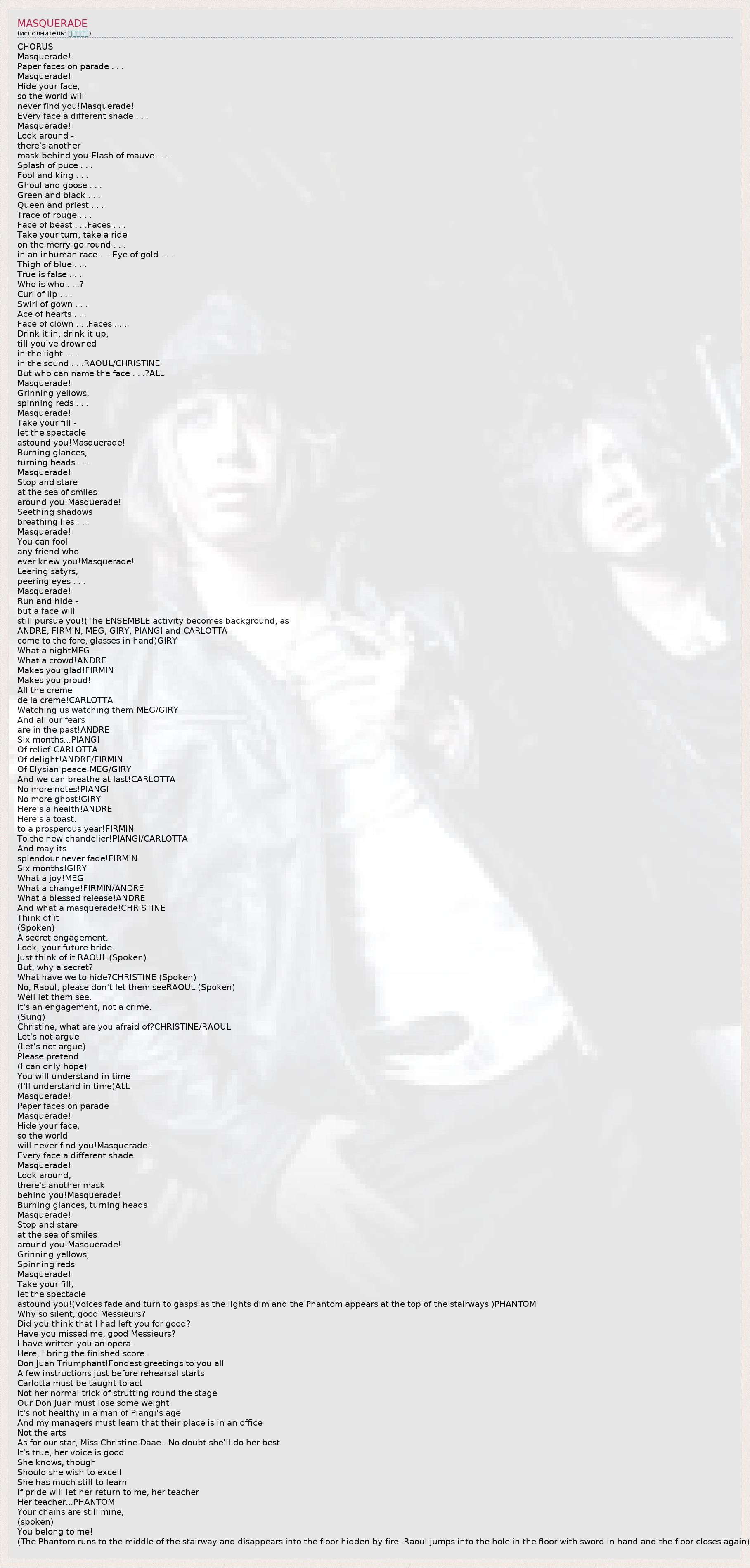 CHORUS Masquerade! Paper faces on parade . . . Masquerade! Hide your face, so the world will never find you!Masquerade! Every face a different shade . . . Masquerade! Look around - there's another mask behind you!Flash of mauve . . . Splash of puce . . . Fool and king . . . Ghoul and goose . . . Green and black . . . Queen and priest . . . Trace of rouge . . . Face of beast . . .Faces . . . Take your turn, take a ride on the merry-go-round . . . in an inhuman race . . .Eye of gold . . . Thigh of blue . . . True is false . . . Who is who . . .? Curl of lip . . . Swirl of gown . . . Ace of hearts . . . Face of clown . . .Faces . . . Drink it in, drink it up, till you've drowned in the light . . . in the sound . . .RAOUL/CHRISTINE But who can name the face . . .?ALL Masquerade! Grinning yellows, spinning reds . . . Masquerade! Take your fill - let the spectacle astound you!Masquerade! Burning glances, turning heads . . . Masquerade! Stop and stare at the sea of smiles around you!Masquerade! Seething shadows breathing lies . . . Masquerade! You can fool any friend who ever knew you!Masquerade! Leering satyrs, peering eyes . . . Masquerade! Run and hide - but a face will still pursue you!(The ENSEMBLE activity becomes background, as ANDRE, FIRMIN, MEG, GIRY, PIANGI and CARLOTTA come to the fore, glasses in hand)GIRY What a nightMEG What a crowd!ANDRE Makes you glad!FIRMIN Makes you proud! All the creme de la creme!CARLOTTA Watching us watching them!MEG/GlRY And all our fears are in the past!ANDRE Six months...PIANGI Of relief!CARLOTTA Of delight!ANDRE/FIRMIN Of Elysian peace!MEG/GIRY And we can breathe at last!CARLOTTA No more notes!PIANGI No more ghost!GIRY Here's a health!ANDRE Here's a toast: to a prosperous year!FIRMIN To the new chandelier!PIANGI/CARLOTTA And may its splendour never fade!FIRMIN Six months!GIRY What a joy!MEG What a change!FIRMIN/ANDRE What a blessed release!ANDRE And what a masquerade!CHRISTINE Think of it (Spoken) A secret engagement. Look, your future bride. Just think of it.RAOUL (Spoken) But, why a secret? What have we to hide?CHRISTINE (Spoken) No, Raoul, please don't let them seeRAOUL (Spoken) Well let them see. It's an engagement, not a crime. (Sung) Christine, what are you afraid of?CHRISTINE/RAOUL Let's not argue (Let's not argue) Please pretend (I can only hope) You will understand in time (I'll understand in time)ALL Masquerade! Paper faces on parade Masquerade! Hide your face, so the world will never find you!Masquerade! Every face a different shade Masquerade! Look around, there's another mask behind you!Masquerade! Burning glances, turning heads Masquerade! Stop and stare at the sea of smiles around you!Masquerade! Grinning yellows, Spinning reds Masquerade! Take your fill, let the spectacle astound you!(Voices fade and turn to gasps as the lights dim and the Phantom appears at the top of the stairways )PHANTOM Why so silent, good Messieurs? Did you think that I had left you for good? Have you missed me, good Messieurs? I have written you an opera. Here, I bring the finished score. Don Juan Triumphant!Fondest greetings to you all A few instructions just before rehearsal starts Carlotta must be taught to act Not her normal trick of strutting round the stage Our Don Juan must lose some weight It's not healthy in a man of Piangi's age And my managers must learn that their place is in an office Not the arts As for our star, Miss Christine Daae...No doubt she'll do her best It's true, her voice is good She knows, though Should she wish to excell She has much still to learn If pride will let her return to me, her teacher Her teacher...PHANTOM Your chains are still mine, (spoken) You belong to me! (The Phantom runs to the middle of the stairway and disappears into the floor hidden by fire. Raoul jumps into the hole in the floor with sword in hand and the floor closes again)