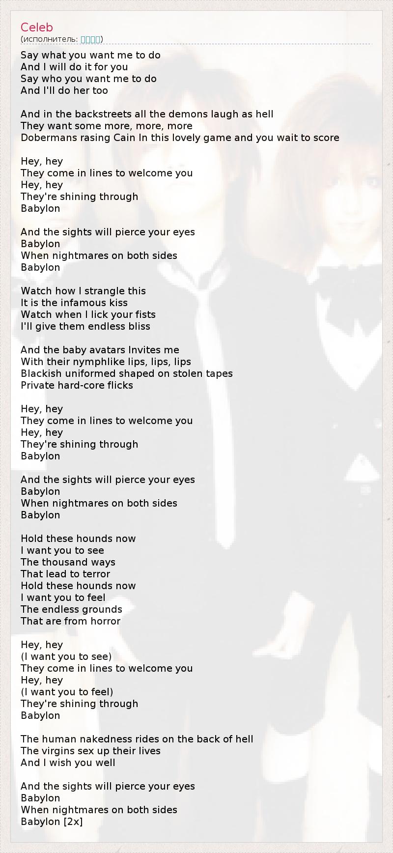 Скажи, что ты хочешь, чтобы я сделал, И я сделаю это ради тебя. Скажи, с кем ты хочешь, чтобы я расплавился, И я с ней тоже расправлюсь. А в подворотнях демоны смеются, что похоже на ад. Они хотят большего, большего, большего... Доберманы поднимают шум в этой милой игре, и ты ожидаешь успеха. Эй, эй, Они выстраиваются в линию и зазывают тебя Эй, эй, Их хорошо видно – Это Вавилон. То, что ты видишь, проколет твои глаза. Вавилон... Когда тебя душат ночные кошмары – Вавилон... Смотри, как я пресекаю это. Это всего лишь мерзкий поцелуй. Смотри, как я облизываю твои кулаки, Я дарю им вечное блаженство. Детские образы зазывают меня Своими пухлыми губами, губами, губами... В темном одеянии, подпоясанные украденными лентами – Видео для домашнего просмотра. Эй, эй, Они выстраиваются в линию и зазывают тебя Эй, эй, Их хорошо видно – Это Вавилон. То, что ты видишь, проколет твои глаза. Вавилон... Когда тебя душат ночные кошмары – Вавилон... Придержи этих борзых – Я хочу, чтобы ты увидел Тысячи путей, Ведущих к ужасу. Придержи этих борзых – Я хочу, чтобы ты почувствовал Вечную землю под ногами, Появляющуюся от ужаса. Эй, эй, (я хочу, чтобы ты увидел...) Они выстраиваются в линию и зазывают тебя Эй, эй, (я хочу, чтобы ты почувствовал...) Их хорошо видно – Это Вавилон. Человеческая нагота ездит на спине ада. Девственницы полны извращенных мыслей. А я желаю тебе хорошего... То, что ты видишь, проколет твои глаза. Вавилон... Когда тебя душат ночные кошмары – Вавилон... [2 раза]