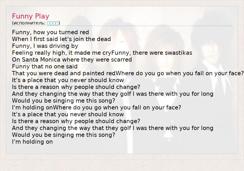 Funny, how you turned red When I first said let's join the dead Funny, I was driving by Feeling really high, it made me cryFunny, there were swastikas On Santa Monica where they were scarred Funny that no one said That you were dead and painted redWhere do you go when you fall on your face? It's a place that you never should know Is there a reason why people should change? And they changing the way that they goIf I was there with you for long Would you be singing me this song? I'm holding onWhere do you go when you fall on your face? It's a place that you never should know Is there a reason why people should change? And they changing the way that they goIf I was there with you for long Would you be singing me this song? I'm holding on