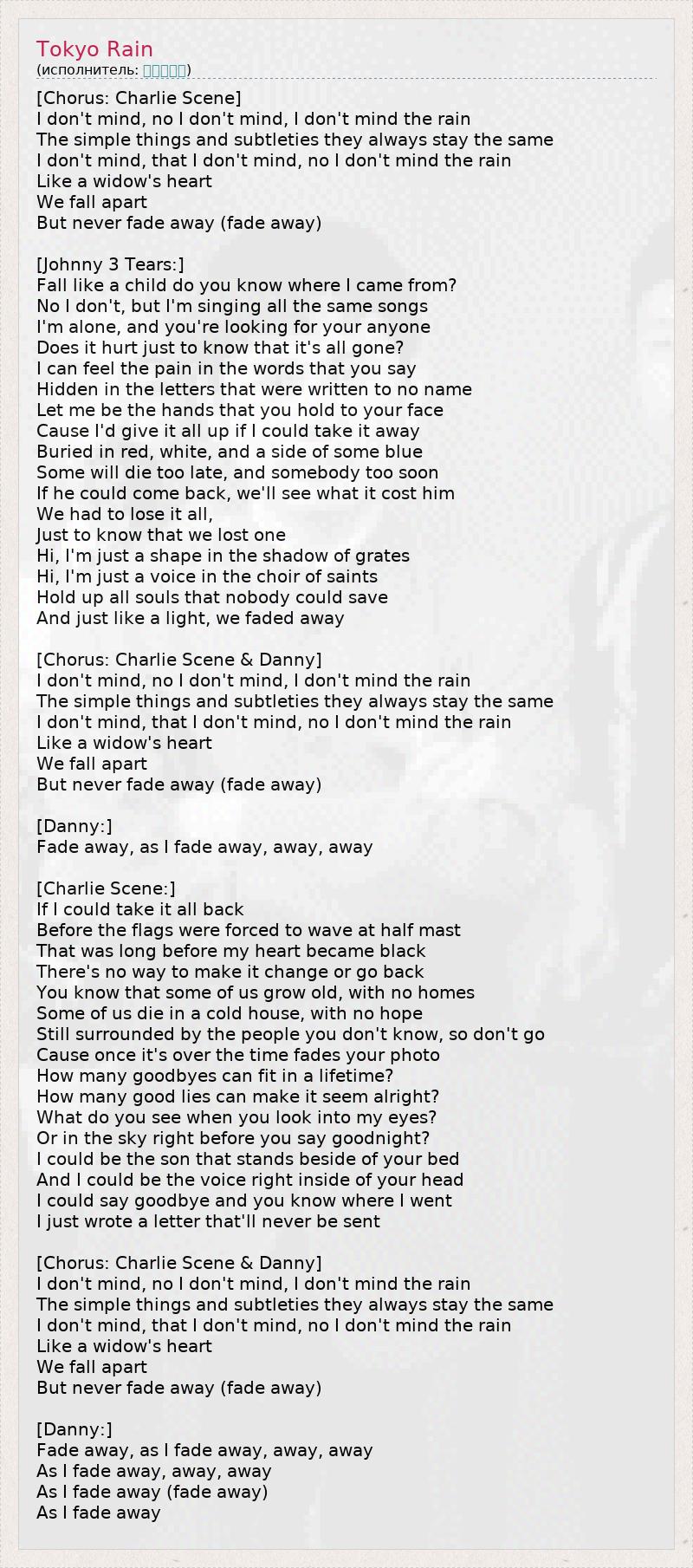 [Chorus: Charlie Scene] I don't mind, no I don't mind, I don't mind the rain The simple things and subtleties they always stay the same I don't mind, that I don't mind, no I don't mind the rain Like a widow's heart We fall apart But never fade away (fade away) [Johnny 3 Tears:] Fall like a child do you know where I came from? No I don't, but I'm singing all the same songs I'm alone, and you're looking for your anyone Does it hurt just to know that it's all gone? I can feel the pain in the words that you say Hidden in the letters that were written to no name Let me be the hands that you hold to your face Cause I'd give it all up if I could take it away Buried in red, white, and a side of some blue Some will die too late, and somebody too soon If he could come back, we'll see what it cost him We had to lose it all, Just to know that we lost one Hi, I'm just a shape in the shadow of grates Hi, I'm just a voice in the choir of saints Hold up all souls that nobody could save And just like a light, we faded away [Chorus: Charlie Scene & Danny] I don't mind, no I don't mind, I don't mind the rain The simple things and subtleties they always stay the same I don't mind, that I don't mind, no I don't mind the rain Like a widow's heart We fall apart But never fade away (fade away) [Danny:] Fade away, as I fade away, away, away [Charlie Scene:] If I could take it all back Before the flags were forced to wave at half mast That was long before my heart became black There's no way to make it change or go back You know that some of us grow old, with no homes Some of us die in a cold house, with no hope Still surrounded by the people you don't know, so don't go Cause once it's over the time fades your photo How many goodbyes can fit in a lifetime? How many good lies can make it seem alright? What do you see when you look into my eyes? Or in the sky right before you say goodnight? I could be the son that stands beside of your bed And I could be the voice right inside of your head I could say goodbye and you know where I went I just wrote a letter that'll never be sent [Chorus: Charlie Scene & Danny] I don't mind, no I don't mind, I don't mind the rain The simple things and subtleties they always stay the same I don't mind, that I don't mind, no I don't mind the rain Like a widow's heart We fall apart But never fade away (fade away) [Danny:] Fade away, as I fade away, away, away As I fade away, away, away As I fade away (fade away) As I fade away