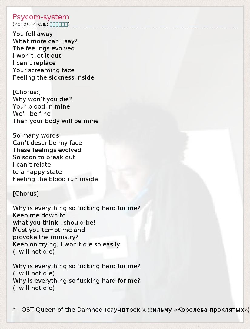 You fell away What more can I say? The feelings evolved I won't let it out I can't replace Your screaming face Feeling the sickness inside [Chorus:] Why won't you die? Your blood in mine We'll be fine Then your body will be mine So many words Can't describe my face These feelings evolved So soon to break out I can't relate to a happy state Feeling the blood run inside [Chorus] Why is everything so fucking hard for me? Keep me down to what you think I should be! Must you tempt me and provoke the ministry? Keep on trying, I won't die so easily (I will not die) Why is everything so fucking hard for me? (I will not die) Why is everything so fucking hard for me? (I will not die) * - OST Queen of the Damned (саундтрек к фильму «Королева проклятых»)