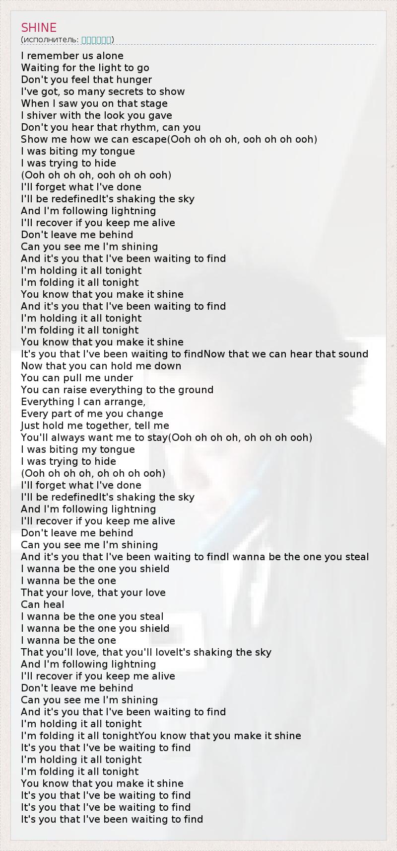 I remember us alone Waiting for the light to go Don't you feel that hunger I've got, so many secrets to show When I saw you on that stage I shiver with the look you gave Don't you hear that rhythm, can you Show me how we can escape(Ooh oh oh oh, ooh oh oh ooh) I was biting my tongue I was trying to hide (Ooh oh oh oh, ooh oh oh ooh) I'll forget what I've done I'll be redefinedIt's shaking the sky And I'm following lightning I'll recover if you keep me alive Don't leave me behind Can you see me I'm shining And it's you that I've been waiting to find I'm holding it all tonight I'm folding it all tonight You know that you make it shine And it's you that I've been waiting to find I'm holding it all tonight I'm folding it all tonight You know that you make it shine It's you that I've been waiting to findNow that we can hear that sound Now that you can hold me down You can pull me under You can raise everything to the ground Everything I can arrange, Every part of me you change Just hold me together, tell me You'll always want me to stay(Ooh oh oh oh, oh oh oh ooh) I was biting my tongue I was trying to hide (Ooh oh oh oh, oh oh oh ooh) I'll forget what I've done I'll be redefinedIt's shaking the sky And I'm following lightning I'll recover if you keep me alive Don't leave me behind Can you see me I'm shining And it's you that I've been waiting to findI wanna be the one you steal I wanna be the one you shield I wanna be the one That your love, that your love Can heal I wanna be the one you steal I wanna be the one you shield I wanna be the one That you'll love, that you'll loveIt's shaking the sky And I'm following lightning I'll recover if you keep me alive Don't leave me behind Can you see me I'm shining And it's you that I've been waiting to find I'm holding it all tonight I'm folding it all tonightYou know that you make it shine It's you that I've be waiting to find I'm holding it all tonight I'm folding it all tonight You know that you make it shine It's you that I've be waiting to find It's you that I've be waiting to find It's you that I've been waiting to find