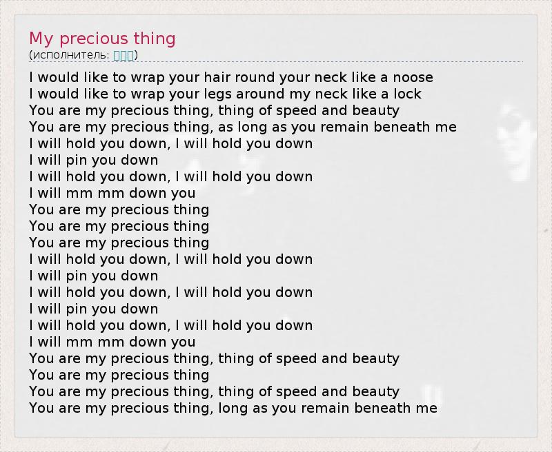 I would like to wrap your hair round your neck like a noose I would like to wrap your legs around my neck like a lock You are my precious thing, thing of speed and beauty You are my precious thing, as long as you remain beneath me I will hold you down, I will hold you down I will pin you down I will hold you down, I will hold you down I will mm mm down you You are my precious thing You are my precious thing You are my precious thing I will hold you down, I will hold you down I will pin you down I will hold you down, I will hold you down I will pin you down I will hold you down, I will hold you down I will mm mm down you You are my precious thing, thing of speed and beauty You are my precious thing You are my precious thing, thing of speed and beauty You are my precious thing, long as you remain beneath me