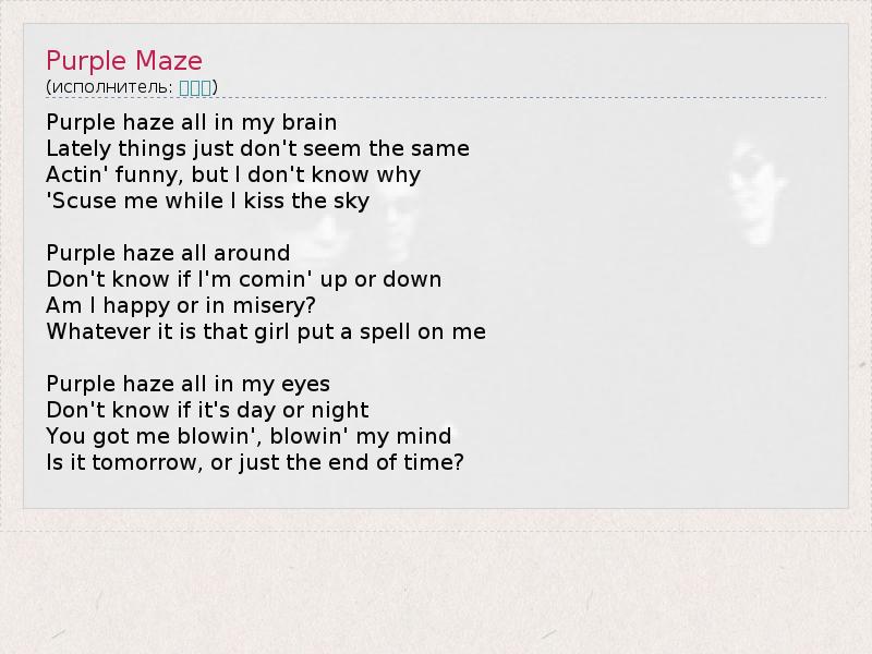 Purple haze all in my brain Lately things just don't seem the same Actin' funny, but I don't know why 'Scuse me while I kiss the sky Purple haze all around Don't know if I'm comin' up or down Am I happy or in misery? Whatever it is that girl put a spell on me Purple haze all in my eyes Don't know if it's day or night You got me blowin', blowin' my mind Is it tomorrow, or just the end of time?