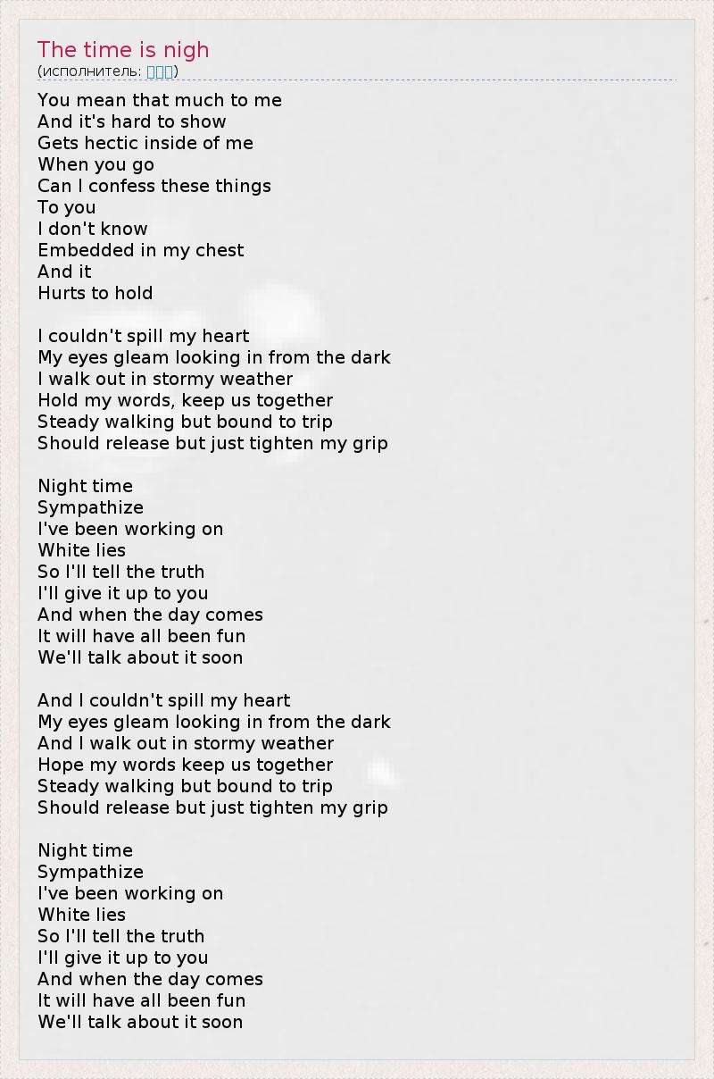You mean that much to me And it's hard to show Gets hectic inside of me When you go Can I confess these things To you I don't know Embedded in my chest And it Hurts to hold I couldn't spill my heart My eyes gleam looking in from the dark I walk out in stormy weather Hold my words, keep us together Steady walking but bound to trip Should release but just tighten my grip Night time Sympathize I've been working on White lies So I'll tell the truth I'll give it up to you And when the day comes It will have all been fun We'll talk about it soon And I couldn't spill my heart My eyes gleam looking in from the dark And I walk out in stormy weather Hope my words keep us together Steady walking but bound to trip Should release but just tighten my grip Night time Sympathize I've been working on White lies So I'll tell the truth I'll give it up to you And when the day comes It will have all been fun We'll talk about it soon