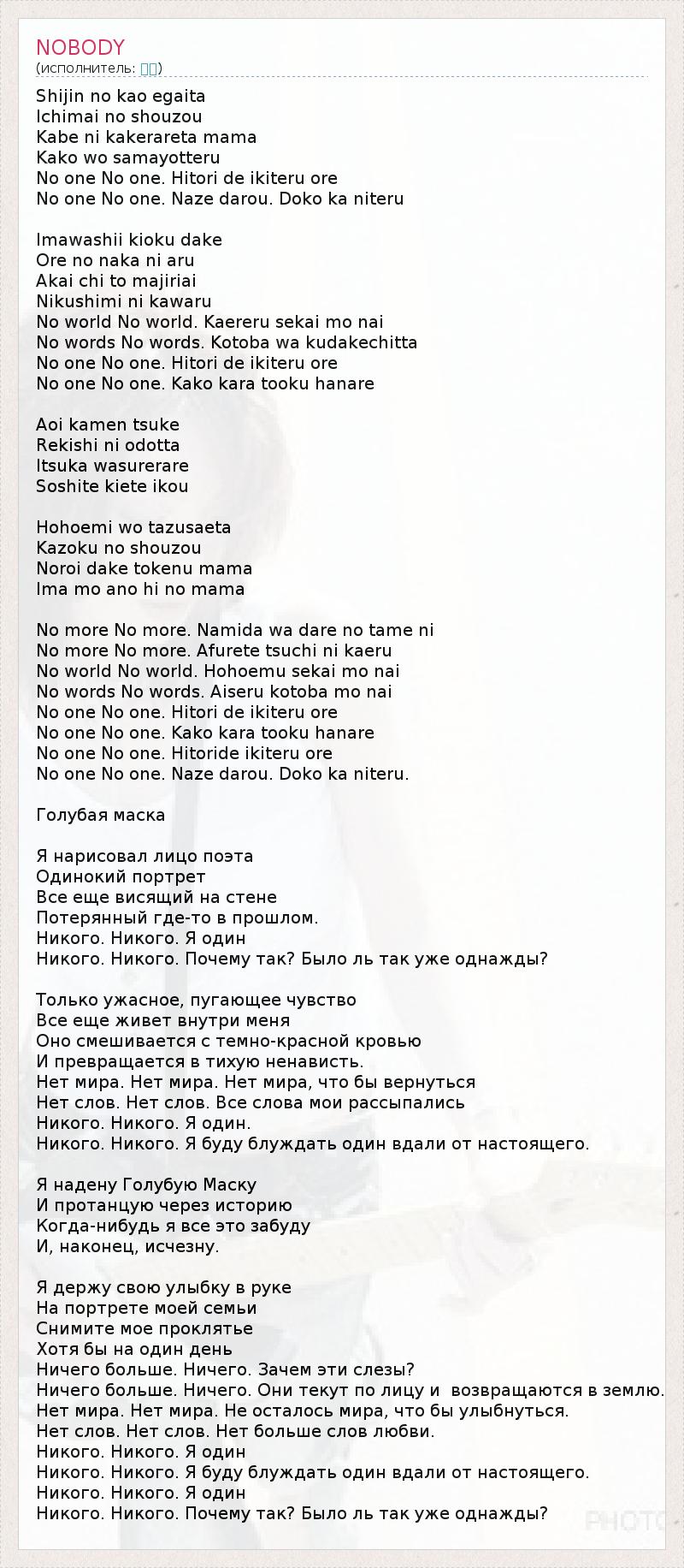 Shijin no kao egaita Ichimai no shouzou Kabe ni kakerareta mama Kako wo samayotteru No one No one. Hitori de ikiteru ore No one No one. Naze darou. Doko ka niteru Imawashii kioku dake Ore no naka ni aru Akai chi to majiriai Nikushimi ni kawaru No world No world. Kaereru sekai mo nai No words No words. Kotoba wa kudakechitta No one No one. Hitori de ikiteru ore No one No one. Kako kara tooku hanare Aoi kamen tsuke Rekishi ni odotta Itsuka wasurerare Soshite kiete ikou Hohoemi wo tazusaeta Kazoku no shouzou Noroi dake tokenu mama Ima mo ano hi no mama No more No more. Namida wa dare no tame ni No more No more. Afurete tsuchi ni kaeru No world No world. Hohoemu sekai mo nai No words No words. Aiseru kotoba mo nai No one No one. Hitori de ikiteru ore No one No one. Kako kara tooku hanare No one No one. Hitoride ikiteru ore No one No one. Naze darou. Doko ka niteru. Голубая маска Я нарисовал лицо поэта Одинокий портрет Все еще висящий на стене Потерянный где-то в прошлом. Никого. Никого. Я один Никого. Никого. Почему так? Было ль так уже однажды? Только ужасное, пугающее чувство Все еще живет внутри меня Оно смешивается с темно-красной кровью И превращается в тихую ненависть. Нет мира. Нет мира. Нет мира, что бы вернуться Нет слов. Нет слов. Все слова мои рассыпались Никого. Никого. Я один. Никого. Никого. Я буду блуждать один вдали от настоящего. Я надену Голубую Маску И протанцую через историю Когда-нибудь я все это забуду И, наконец, исчезну. Я держу свою улыбку в руке На портрете моей семьи Снимите мое проклятье Хотя бы на один день Ничего больше. Ничего. Зачем эти слезы? Ничего больше. Ничего. Они текут по лицу и возвращаются в землю. Нет мира. Нет мира. Не осталось мира, что бы улыбнуться. Нет слов. Нет слов. Нет больше слов любви. Никого. Никого. Я один Никого. Никого. Я буду блуждать один вдали от настоящего. Никого. Никого. Я один Никого. Никого. Почему так? Было ль так уже однажды?