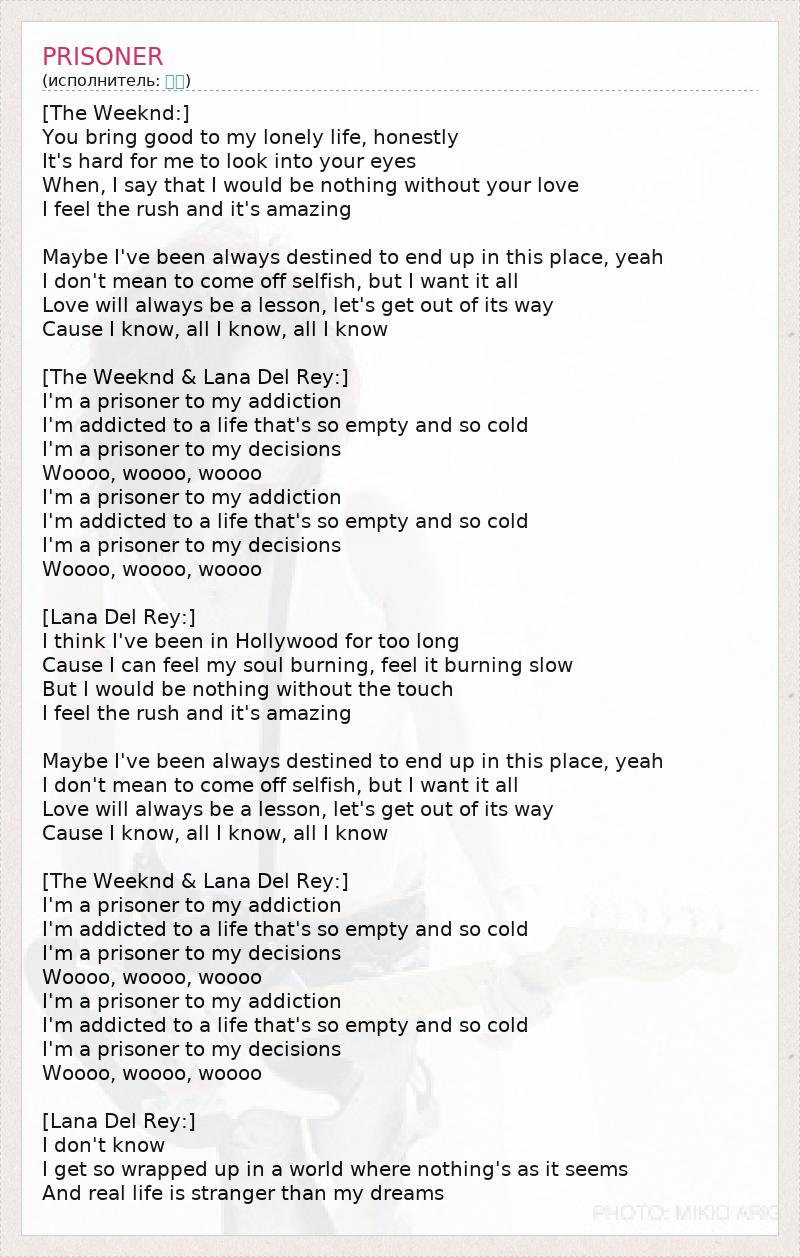 [The Weeknd:] You bring good to my lonely life, honestly It's hard for me to look into your eyes When, I say that I would be nothing without your love I feel the rush and it's amazing Maybe I've been always destined to end up in this place, yeah I don't mean to come off selfish, but I want it all Love will always be a lesson, let's get out of its way Cause I know, all I know, all I know [The Weeknd & Lana Del Rey:] I'm a prisoner to my addiction I'm addicted to a life that's so empty and so cold I'm a prisoner to my decisions Woooo, woooo, woooo I'm a prisoner to my addiction I'm addicted to a life that's so empty and so cold I'm a prisoner to my decisions Woooo, woooo, woooo [Lana Del Rey:] I think I've been in Hollywood for too long Cause I can feel my soul burning, feel it burning slow But I would be nothing without the touch I feel the rush and it's amazing Maybe I've been always destined to end up in this place, yeah I don't mean to come off selfish, but I want it all Love will always be a lesson, let's get out of its way Cause I know, all I know, all I know [The Weeknd & Lana Del Rey:] I'm a prisoner to my addiction I'm addicted to a life that's so empty and so cold I'm a prisoner to my decisions Woooo, woooo, woooo I'm a prisoner to my addiction I'm addicted to a life that's so empty and so cold I'm a prisoner to my decisions Woooo, woooo, woooo [Lana Del Rey:] I don't know I get so wrapped up in a world where nothing's as it seems And real life is stranger than my dreams