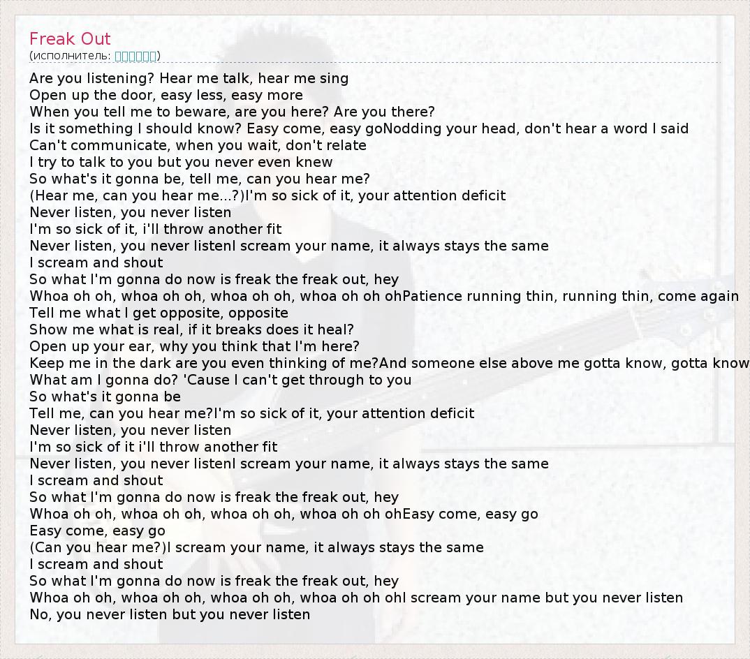 Are you listening? Hear me talk, hear me sing Open up the door, easy less, easy more When you tell me to beware, are you here? Are you there? Is it something I should know? Easy come, easy goNodding your head, don't hear a word I said Can't communicate, when you wait, don't relate I try to talk to you but you never even knew So what's it gonna be, tell me, can you hear me? (Hear me, can you hear me...?)I'm so sick of it, your attention deficit Never listen, you never listen I'm so sick of it, i'll throw another fit Never listen, you never listenI scream your name, it always stays the same I scream and shout So what I'm gonna do now is freak the freak out, hey Whoa oh oh, whoa oh oh, whoa oh oh, whoa oh oh ohPatience running thin, running thin, come again Tell me what I get opposite, opposite Show me what is real, if it breaks does it heal? Open up your ear, why you think that I'm here? Keep me in the dark are you even thinking of me?And someone else above me gotta know, gotta know What am I gonna do? 'Cause I can't get through to you So what's it gonna be Tell me, can you hear me?I'm so sick of it, your attention deficit Never listen, you never listen I'm so sick of it i'll throw another fit Never listen, you never listenI scream your name, it always stays the same I scream and shout So what I'm gonna do now is freak the freak out, hey Whoa oh oh, whoa oh oh, whoa oh oh, whoa oh oh ohEasy come, easy go Easy come, easy go (Can you hear me?)I scream your name, it always stays the same I scream and shout So what I'm gonna do now is freak the freak out, hey Whoa oh oh, whoa oh oh, whoa oh oh, whoa oh oh ohI scream your name but you never listen No, you never listen but you never listen