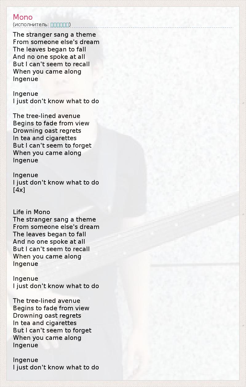 The stranger sang a theme From someone else's dream The leaves began to fall And no one spoke at all But I can't seem to recall When you came along Ingenue Ingenue I just don't know what to do The tree-lined avenue Begins to fade from view Drowning oast regrets In tea and cigarettes But I can't seem to forget When you came along Ingenue Ingenue I just don't know what to do [4х] Life in Mono The stranger sang a theme From someone else's dream The leaves began to fall And no one spoke at all But I can't seem to recall When you came along Ingenue Ingenue I just don't know what to do The tree-lined avenue Begins to fade from view Drowning oast regrets In tea and cigarettes But I can't seem to forget When you came along Ingenue Ingenue I just don't know what to do