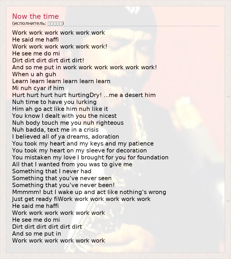 Work work work work work work He said me haffi Work work work work work work! He see me do mi Dirt dirt dirt dirt dirt dirt! And so me put in work work work work work work! When u ah guh Learn learn learn learn learn learn Mi nuh cyar if him Hurt hurt hurt hurt hurtingDry! ...me a desert him Nuh time to have you lurking Him ah go act like him nuh like it You know I dealt with you the nicest Nuh body touch me you nuh righteous Nuh badda, text me in a crisis I believed all of ya dreams, adoration You took my heart and my keys and my patience You took my heart on my sleeve for decoration You mistaken my love I brought for you for foundation All that I wanted from you was to give me Something that I never had Something that you've never seen Something that you've never been! Mmmmm! but I wake up and act like nothing's wrong Just get ready fiWork work work work work work He said me haffi Work work work work work work He see me do mi Dirt dirt dirt dirt dirt dirt And so me put in Work work work work work work