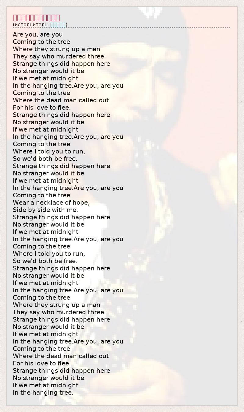 Are you, are you Coming to the tree Where they strung up a man They say who murdered three. Strange things did happen here No stranger would it be If we met at midnight In the hanging tree.Are you, are you Coming to the tree Where the dead man called out For his love to flee. Strange things did happen here No stranger would it be If we met at midnight In the hanging tree.Are you, are you Coming to the tree Where I told you to run, So we'd both be free. Strange things did happen here No stranger would it be If we met at midnight In the hanging tree.Are you, are you Coming to the tree Wear a necklace of hope, Side by side with me. Strange things did happen here No stranger would it be If we met at midnight In the hanging tree.Are you, are you Coming to the tree Where I told you to run, So we'd both be free. Strange things did happen here No stranger would it be If we met at midnight In the hanging tree.Are you, are you Coming to the tree Where they strung up a man They say who murdered three. Strange things did happen here No stranger would it be If we met at midnight In the hanging tree.Are you, are you Coming to the tree Where the dead man called out For his love to flee. Strange things did happen here No stranger would it be If we met at midnight In the hanging tree.