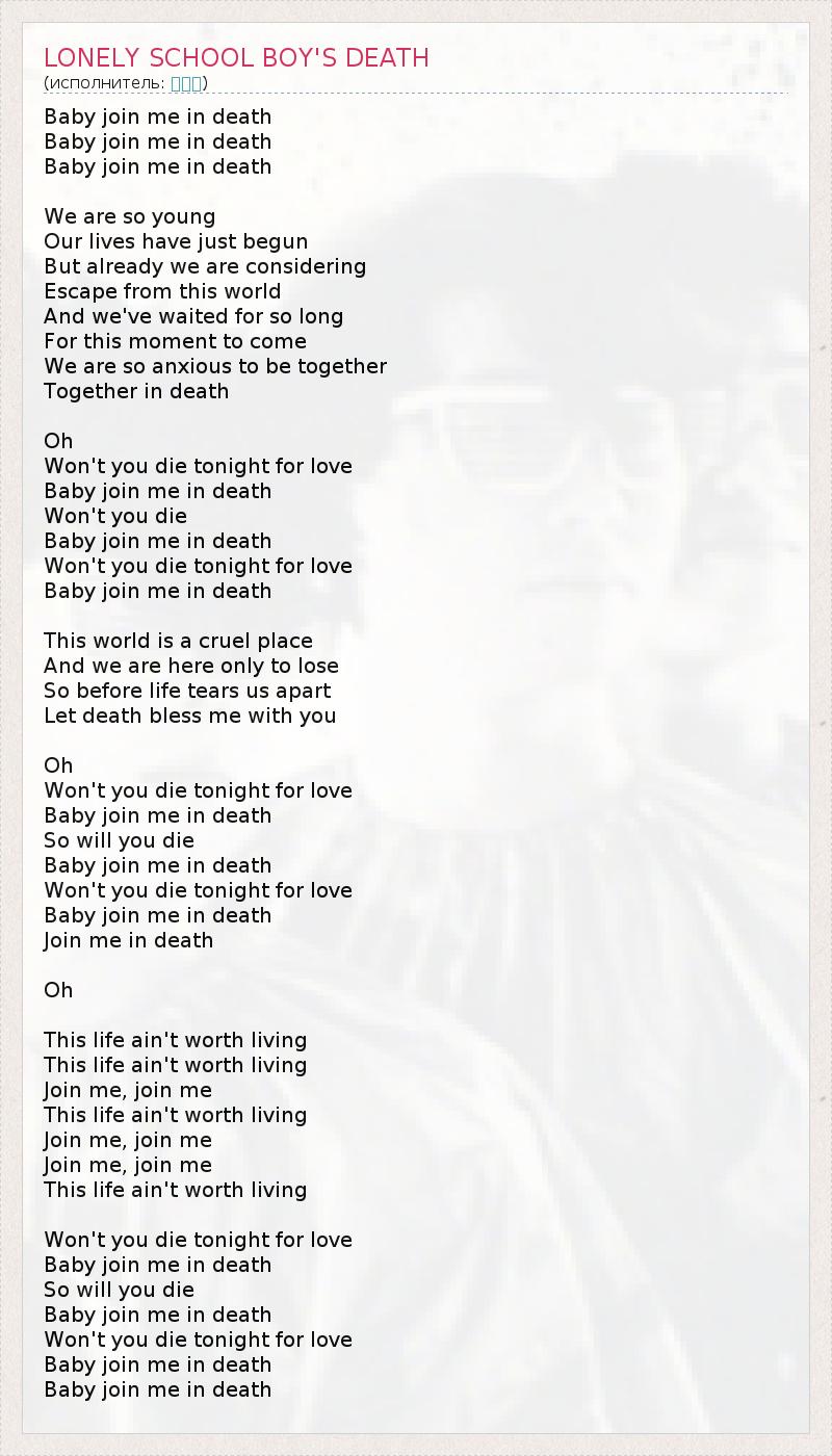 Baby join me in death Baby join me in death Baby join me in death We are so young Our lives have just begun But already we are considering Escape from this world And we've waited for so long For this moment to come We are so anxious to be together Together in death Oh Won't you die tonight for love Baby join me in death Won't you die Baby join me in death Won't you die tonight for love Baby join me in death This world is a cruel place And we are here only to lose So before life tears us apart Let death bless me with you Oh Won't you die tonight for love Baby join me in death So will you die Baby join me in death Won't you die tonight for love Baby join me in death Join me in death Oh This life ain't worth living This life ain't worth living Join me, join me This life ain't worth living Join me, join me Join me, join me This life ain't worth living Won't you die tonight for love Baby join me in death So will you die Baby join me in death Won't you die tonight for love Baby join me in death Baby join me in death