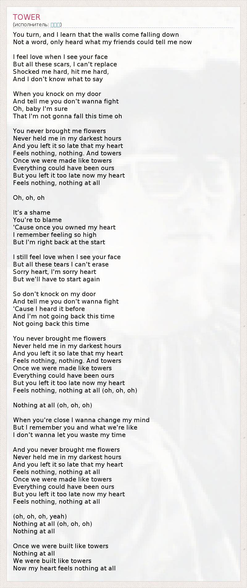 You turn, and I learn that the walls come falling down Not a word, only heard what my friends could tell me now I feel love when I see your face But all these scars, I can't replace Shocked me hard, hit me hard, And I don't know what to say When you knock on my door And tell me you don't wanna fight Oh, baby I'm sure That I'm not gonna fall this time oh You never brought me flowers Never held me in my darkest hours And you left it so late that my heart Feels nothing, nothing. And towers Once we were made like towers Everything could have been ours But you left it too late now my heart Feels nothing, nothing at all Oh, oh, oh It's a shame You're to blame 'Cause once you owned my heart I remember feeling so high But I'm right back at the start I still feel love when I see your face But all these tears I can't erase Sorry heart, I'm sorry heart But we'll have to start again So don't knock on my door And tell me you don't wanna fight 'Cause I heard it before And I'm not going back this time Not going back this time You never brought me flowers Never held me in my darkest hours And you left it so late that my heart Feels nothing, nothing. And towers Once we were made like towers Everything could have been ours But you left it too late now my heart Feels nothing, nothing at all (oh, oh, oh) Nothing at all (oh, oh, oh) When you're close I wanna change my mind But I remember you and what we're like I don't wanna let you waste my time And you never brought me flowers Never held me in my darkest hours And you left it so late that my heart Feels nothing, nothing at all Once we were made like towers Everything could have been ours But you left it too late now my heart Feels nothing, nothing at all (oh, oh, oh, yeah) Nothing at all (oh, oh, oh) Nothing at all Once we were built like towers Nothing at all We were built like towers Now my heart feels nothing at all