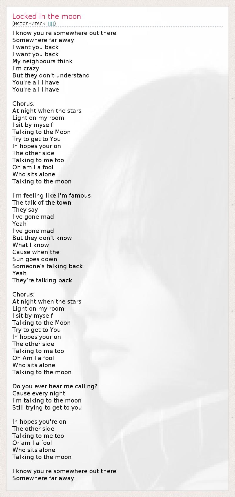 I know you're somewhere out there Somewhere far away I want you back I want you back My neighbours think I'm crazy But they don't understand You're all I have You're all I have Chorus: At night when the stars Light on my room I sit by myself Talking to the Moon Try to get to You In hopes your on The other side Talking to me too Oh am I a fool Who sits alone Talking to the moon I'm feeling like I'm famous The talk of the town They say I've gone mad Yeah I've gone mad But they don't know What I know Cause when the Sun goes down Someone's talking back Yeah They're talking back Chorus: At night when the stars Light on my room I sit by myself Talking to the Moon Try to get to You In hopes your on The other side Talking to me too Oh Am I a fool Who sits alone Talking to the moon Do you ever hear me calling? Cause every night I'm talking to the moon Still trying to get to you In hopes you're on The other side Talking to me too Or am I a fool Who sits alone Talking to the moon I know you're somewhere out there Somewhere far away