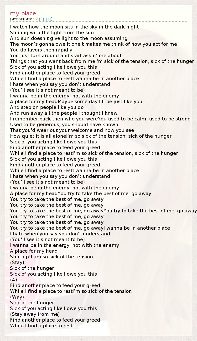 I watch how the moon sits in the sky in the dark night Shining with the light from the sun And sun doesn't give light to the moon assuming The moon's gonna owe it oneIt makes me think of how you act for me You do favors then rapidly You just turn around and start askin' me about Things that you want back from meI'm sick of the tension, sick of the hunger Sick of you acting like I owe you this Find another place to feed your greed While I find a place to restI wanna be in another place I hate when you say you don't understand (You'll see it's not meant to be) I wanna be in the energy, not with the enemy A place for my headMaybe some day I'll be just like you And step on people like you do And run away all the people I thought I knew I remember back then who you wereYou used to be calm, used to be strong Used to be generous, you should have known That you'd wear out your welcome and now you see How quiet it is all aloneI'm so sick of the tension, sick of the hunger Sick of you acting like I owe you this Find another place to feed your greed While I find a place to restI'm so sick of the tension, sick of the hunger Sick of you acting like I owe you this Find another place to feed your greed While I find a place to restI wanna be in another place I hate when you say you don't understand (You'll see it's not meant to be) I wanna be in the energy, not with the enemy A place for my headYou try to take the best of me, go away You try to take the best of me, go away You try to take the best of me, go away You try to take the best of me, go awayYou try to take the best of me, go away You try to take the best of me, go away You try to take the best of me, go away You try to take the best of me, go awayI wanna be in another place I hate when you say you don't understand (You'll see it's not meant to be) I wanna be in the energy, not with the enemy A place for my head Shut up!I am so sick of the tension (Stay) Sick of the hunger Sick of you acting like I owe you this (A) Find another place to feed your greed While I find a place to restI'm so sick of the tension (Way) Sick of the hunger Sick of you acting like I owe you this (Stay away from me) Find another place to feed your greed While I find a place to rest