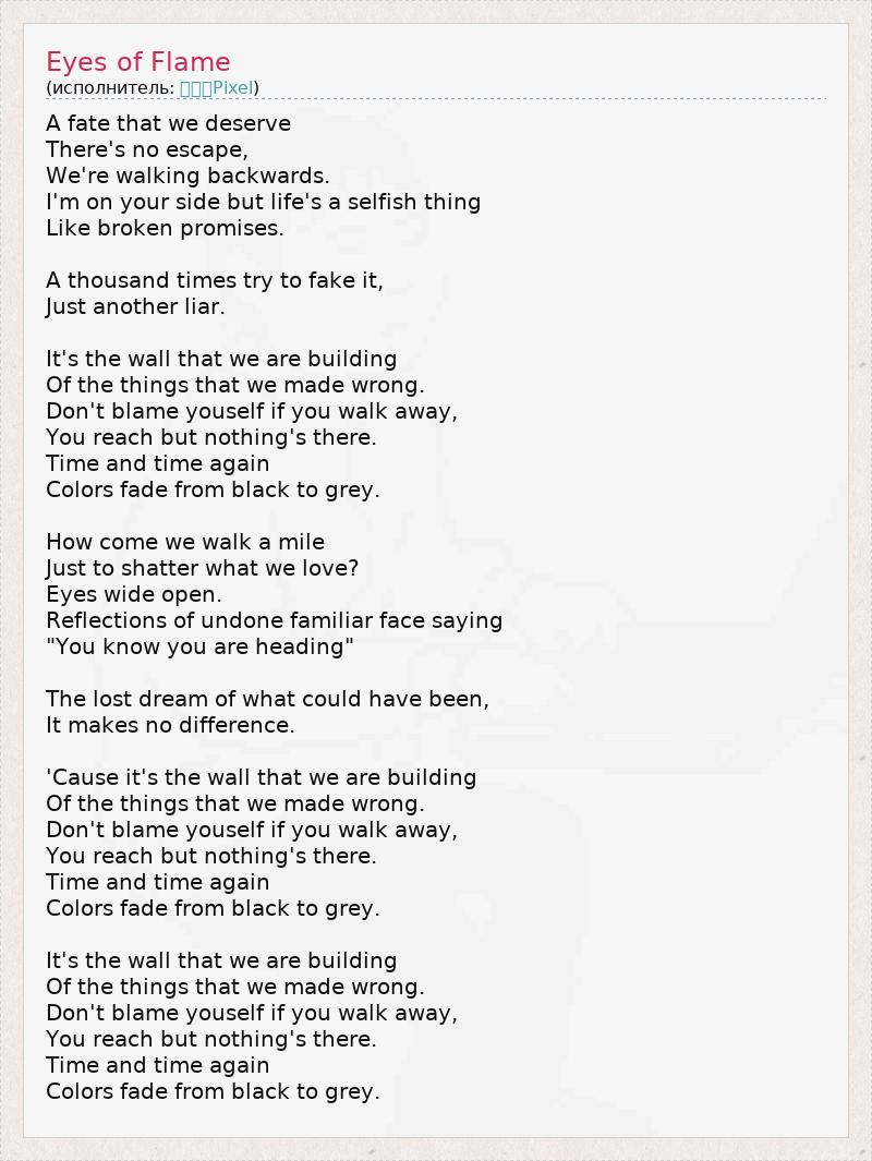 От судьбы, уготованной нам, Не сбежать, Мы идём в обратную сторону. Я с тобой, но жизнь эгоистична, Как нарушенные обещания. Можешь отрицать это тысячу раз, Будешь лишь очередным лжецом. Мы строим эту стену Из того, что сделали неправильно. Не вини себя, если придётся уйти, Ты добьёшься своего, но не сейчас. А цвета угасают Вновь и вновь. Как получилось так, что мы прошли весь этот путь, Чтобы разрушить то, что мы любили? Глаза теперь широко открыты. Образы беспомощного, но знакомого лица говорят: "Знаешь, ты ведь нас ведёшь". Позабытая мечта о том, что могло быть, Не играет никакой роли. Потому что мы строим эту стену Из того, что сделали неправильно. Не вини себя, если придётся уйти, Ты добьёшься своего, но не сейчас. А цвета угасают Вновь и вновь. Мы строим эту стену Из того, что сделали неправильно. Не вини себя, если придётся уйти, Ты добьёшься своего, но не сейчас. А цвета угасают Вновь и вновь.