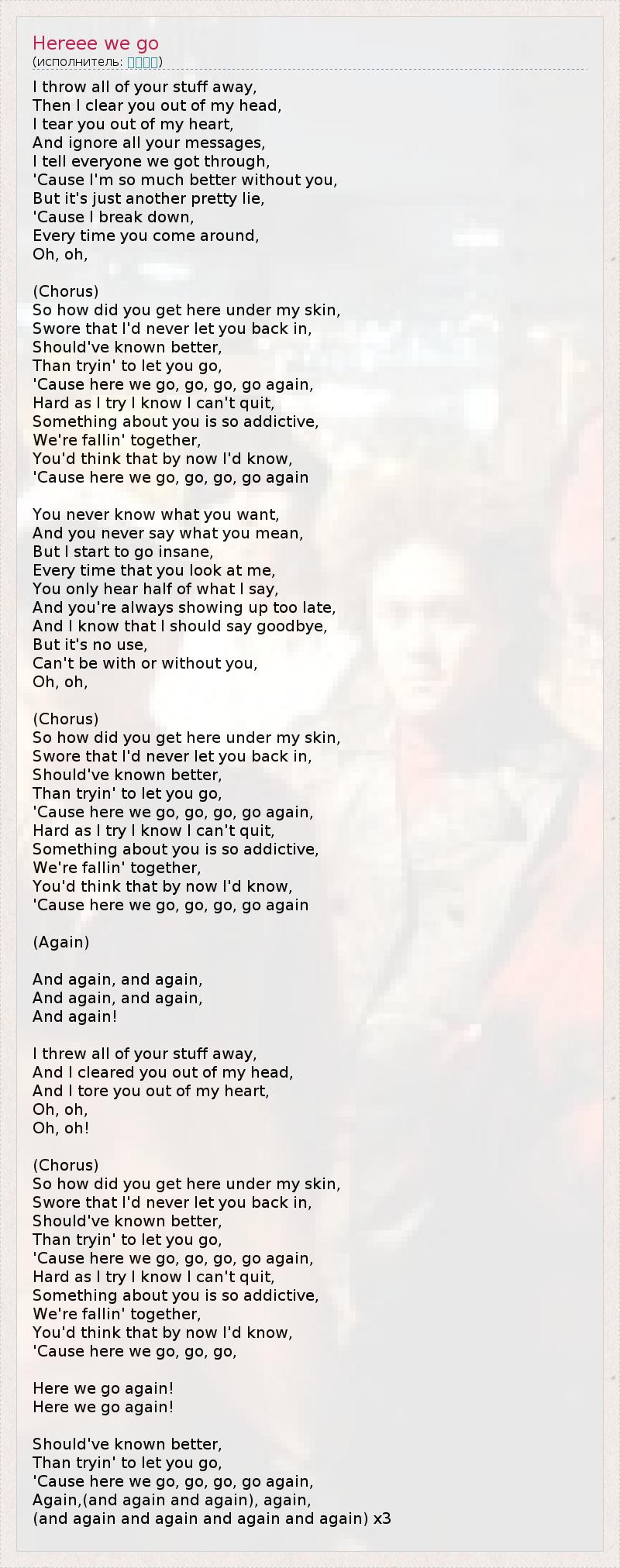 I throw all of your stuff away, Then I clear you out of my head, I tear you out of my heart, And ignore all your messages, I tell everyone we got through, 'Cause I'm so much better without you, But it's just another pretty lie, 'Cause I break down, Every time you come around, Oh, oh, (Chorus) So how did you get here under my skin, Swore that I'd never let you back in, Should've known better, Than tryin' to let you go, 'Cause here we go, go, go, go again, Hard as I try I know I can't quit, Something about you is so addictive, We're fallin' together, You'd think that by now I'd know, 'Cause here we go, go, go, go again You never know what you want, And you never say what you mean, But I start to go insane, Every time that you look at me, You only hear half of what I say, And you're always showing up too late, And I know that I should say goodbye, But it's no use, Can't be with or without you, Oh, oh, (Chorus) So how did you get here under my skin, Swore that I'd never let you back in, Should've known better, Than tryin' to let you go, 'Cause here we go, go, go, go again, Hard as I try I know I can't quit, Something about you is so addictive, We're fallin' together, You'd think that by now I'd know, 'Cause here we go, go, go, go again (Again) And again, and again, And again, and again, And again! I threw all of your stuff away, And I cleared you out of my head, And I tore you out of my heart, Oh, oh, Oh, oh! (Chorus) So how did you get here under my skin, Swore that I'd never let you back in, Should've known better, Than tryin' to let you go, 'Cause here we go, go, go, go again, Hard as I try I know I can't quit, Something about you is so addictive, We're fallin' together, You'd think that by now I'd know, 'Cause here we go, go, go, Here we go again! Here we go again! Should've known better, Than tryin' to let you go, 'Cause here we go, go, go, go again, Again,(and again and again), again, (and again and again and again and again) x3