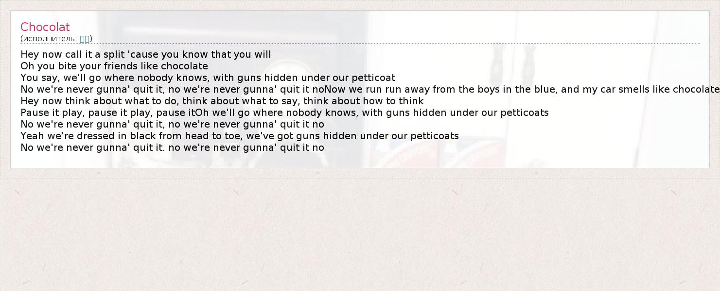 Hey now call it a split 'cause you know that you will Oh you bite your friends like chocolate You say, we'll go where nobody knows, with guns hidden under our petticoat No we're never gunna' quit it, no we're never gunna' quit it noNow we run run away from the boys in the blue, and my car smells like chocolate Hey now think about what to do, think about what to say, think about how to think Pause it play, pause it play, pause itOh we'll go where nobody knows, with guns hidden under our petticoats No we're never gunna' quit it, no we're never gunna' quit it no Yeah we're dressed in black from head to toe, we've got guns hidden under our petticoats No we're never gunna' quit it. no we're never gunna' quit it no