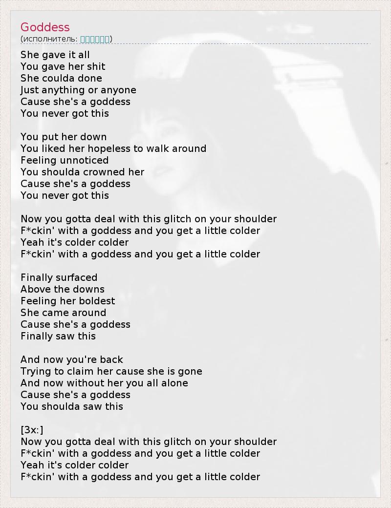 She gave it all You gave her shit She coulda done Just anything or anyone Cause she's a goddess You never got this You put her down You liked her hopeless to walk around Feeling unnoticed You shoulda crowned her Cause she's a goddess You never got this Now you gotta deal with this glitch on your shoulder F*ckin' with a goddess and you get a little colder Yeah it's colder colder F*ckin' with a goddess and you get a little colder Finally surfaced Above the downs Feeling her boldest She came around Cause she's a goddess Finally saw this And now you're back Trying to claim her cause she is gone And now without her you all alone Cause she's a goddess You shoulda saw this [3x:] Now you gotta deal with this glitch on your shoulder F*ckin' with a goddess and you get a little colder Yeah it's colder colder F*ckin' with a goddess and you get a little colder