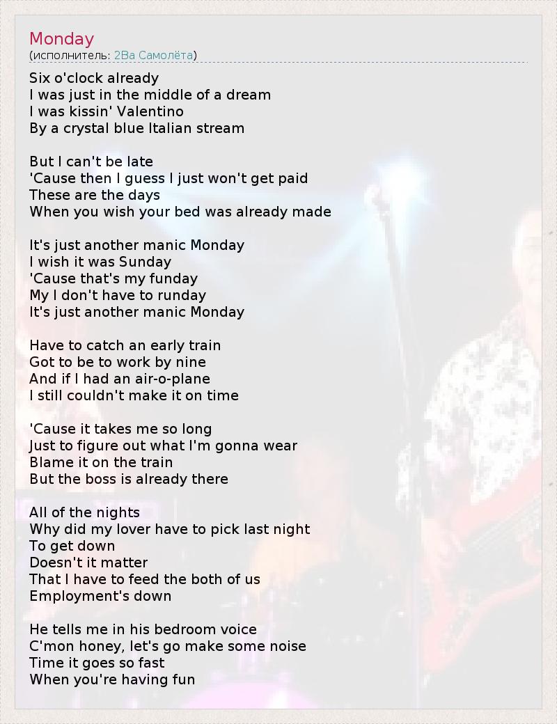 Уже шесть часов, И я была прямо в середине своего сна, Я целовалась с Валентино* У кристально голубой итальянской реки. Но я не могу опаздывать, Потому что тогда, полагаю, мне просто не заплатят. Ох уж эти дни, Когда тебя хочется, чтобы твоя постель уже была убрана. Это просто еще один чумовой понедельник, Как бы я хотела, чтобы он был воскресеньем, Потому что тогда я бы развлекалась, И мне не надо было бы никуда бежать. Это просто еще один чумовой понедельник. Мне нужно успеть на ранний поезд, Надо быть на работе к девяти. Даже если бы у меня был самолет, Я бы все равно не успела бы приехать вовремя. Потому что мне требуется так много времени Даже для того, чтобы решить, что мне надеть, Во всем виноват этот поезд, Но босс уже на месте. Все эти ночи... Почему мой возлюбленный выбирает последнюю ночь, Чтобы уделить мне внимание? Не все ли равно когда, Ведь это мне приходится кормить нас обоих. Работа угнетает. Он говорит мне своим постельным голосом: Милая, давай немножко пошумим. Время течет так быстро, Когда же тебе еще повеселиться? * Рудольфо Валентино (1895 - 1926) - американский киноактёр итальянского происхождения, секс-символ эпохи немого кино.