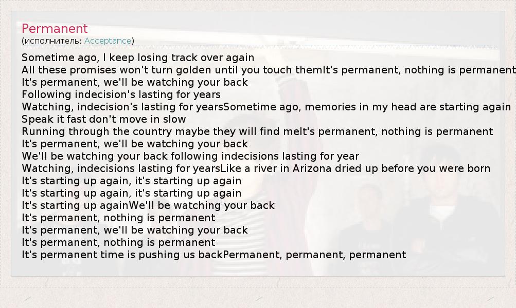 Это интересно:Acceptance - альтернативная рок-группа, образованная в Сиэтле в 1998 году. Их первый EP "Lost for Words" вышел в 2000 году, следующий - "Black Lines to Battlefields" - в 2003. Последняя пластинка "Phantoms" датирована 2005 годом.