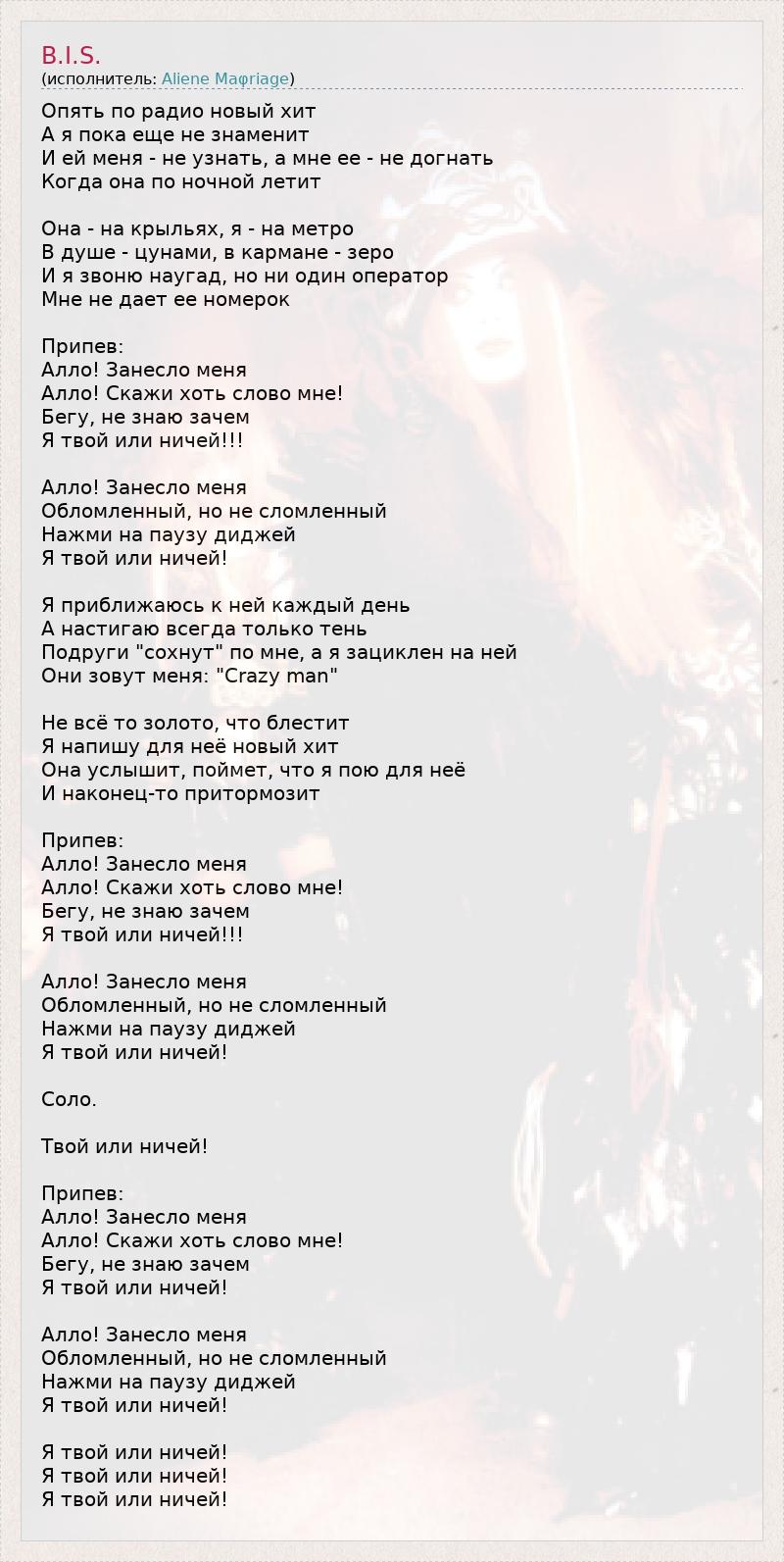 Опять по радио новый хит, а я пока еще не знаменит, и ей меня не узнать, а мне её не догнать когда она по ночной летит. Она на крильях я на метро, в душе цунами в кармане зеро, и я звоню наугад но не один операт мне не даёт её номерок. Припев: Алло, занесло меня, алло ну скажи хоть слово мне, бегу не знаю зачем, я твой или ничей. Алло, занесло меня, обломаны но не сломлены, нажми на паузу диджей, я твой или ничей Я приближаюсь к ней каждый день, а настигаю всегда только тень, подруги сохнут по мне, а я зацыклен на ней, они зовут меня Crazy man! Не всё то золото что блестит, я напишу для неё новый хит, она услышит поймет что я пою для неё и наконец то притормозит. Припев: тот же 2 раза!