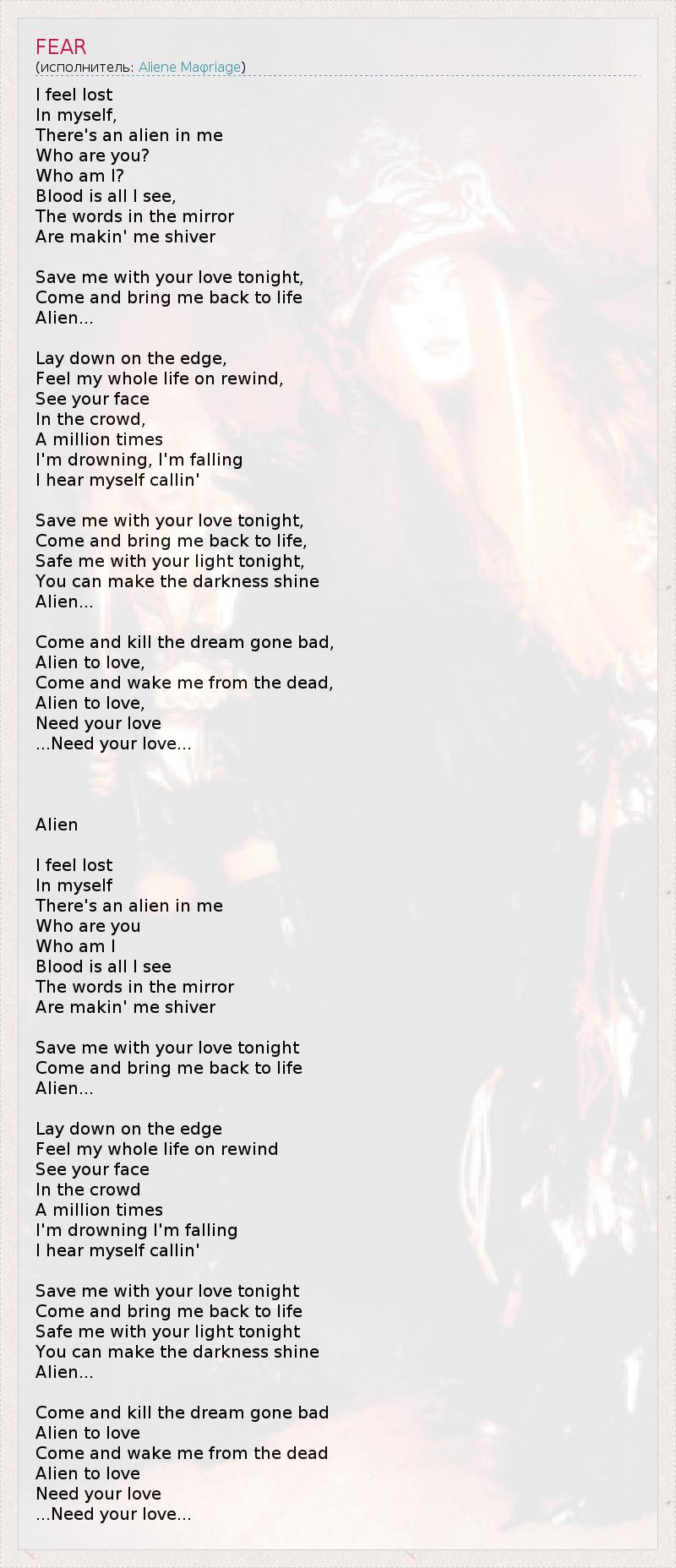 I feel lost In myself, There's an alien in me Who are you? Who am I? Blood is all I see, The words in the mirror Are makin' me shiver Save me with your love tonight, Come and bring me back to life Alien... Lay down оn the edge, Feel my whole life on rewind, See your face In the crowd, A million times I'm drowning, I'm falling I hear myself callin' Save me with your love tonight, Come and bring me back to life, Safe me with your light tonight, You can make the darkness shine Alien... Come and kill the dream gone bad, Alien to love, Come and wake me from the dead, Alien to love, Need your love ...Need your love... Alien I feel lost In myself There's an alien in me Who are you Who am I Blood is all I see The words in the mirror Are makin' me shiver Save me with your love tonight Come and bring me back to life Alien... Lay down оn the edge Feel my whole life on rewind See your face In the crowd A million times I'm drowning I'm falling I hear myself callin' Save me with your love tonight Come and bring me back to life Safe me with your light tonight You can make the darkness shine Alien... Come and kill the dream gone bad Alien to love Come and wake me from the dead Alien to love Need your love ...Need your love...