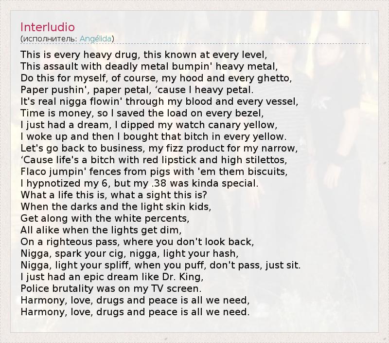 This is every heavy drug, this known at every level, This assault with deadly metal bumpin' heavy metal, Do this for myself, of course, my hood and every ghetto, Paper pushin', paper petal, ‘cause I heavy petal. It's real nigga flowin' through my blood and every vessel, Time is money, so I saved the load on every bezel, I just had a dream, I dipped my watch canary yellow, I woke up and then I bought that bitch in every yellow. Let's go back to business, my fizz product for my narrow, ‘Cause life's a bitch with red lipstick and high stilettos, Flaco jumpin' fences from pigs with 'em them biscuits, I hypnotized my 6, but my .38 was kinda special. What a life this is, what a sight this is? When the darks and the light skin kids, Get along with the white percents, All alike when the lights get dim, On a righteous pass, where you don't look back, Nigga, spark your cig, nigga, light your hash, Nigga, light your spliff, when you puff, don't pass, just sit. I just had an epic dream like Dr. King, Police brutality was on my TV screen. Harmony, love, drugs and peace is all we need, Harmony, love, drugs and peace is all we need.