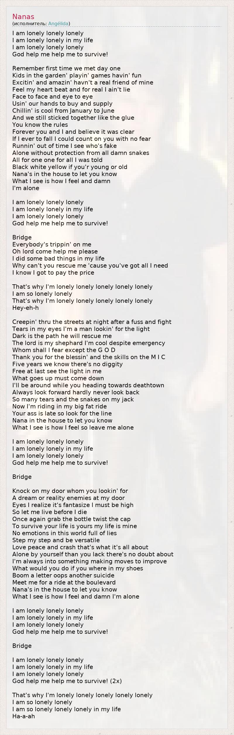 I am lonely lonely lonely I am lonely lonely in my life I am lonely lonely lonely God help me help me to survive! Remember first time we met day one Kids in the garden' playin' games havin' fun Excitin' and amazin' havn't a real friend of mine Feel my heart beat and for real I ain't lie Face to face and eye to eye Usin' our hands to buy and supply Chillin' is cool from January to June And we still sticked together like the glue You know the rules Forever you and I and believe it was clear If I ever to fall I could count on you with no fear Runnin' out of time I see who's fake Alone without protection from all damn snakes All for one one for all I was told Black white yellow if you'r young or old Nana's in the house to let you know What I see is how I feel and damn I'm alone I am lonely lonely lonely I am lonely lonely in my life I am lonely lonely lonely God help me help me to survive! Bridge Everybody's trippin' on me Oh lord come help me please I did some bad things in my life Why can't you rescue me 'cause you've got all I need I know I got to pay the price That's why I'm lonely lonely lonely lonely lonely I am so lonely lonely That's why I'm lonely lonely lonely lonely lonely Hey-eh-h Creepin' thru the streets at night after a fuss and fight Tears in my eyes I'm a man lookin' for the light Dark is the path he will rescue me The lord is my shephard I'm cool despite emergency Whom shall I fear except the G O D Thank you for the blessin' and the skills on the M I C Five years we know there's no diggity Free at last see the light in me What goes up must come down I'll be around while you heading towards deathtown Always look forward hardly never look back So many tears and the snakes on my jack Now I'm riding in my big fat ride Your ass is late so look for the line Nana in the house to let you know What I see is how I feel so leave me alone I am lonely lonely lonely I am lonely lonely in my life I am lonely lonely lonely God help me help me to survive! Bridge Knock on my door whom you lookin' for A dream or reality enemies at my door Eyes I realize it's fantasize I must be high So let me live before I die Once again grab the bottle twist the cap To survive your life is yours my life is mine No emotions in this world full of lies Step my step and be versatile Love peace and crash that's what it's all about Alone by yourself than you lack there's no doubt about I'm always into something making moves to improve What would you do if you where in my shoes Boom a letter oops another suicide Meet me for a ride at the boulevard Nana's in the house to let you know What I see is how I feel and damn I'm alone I am lonely lonely lonely I am lonely lonely in my life I am lonely lonely lonely God help me help me to survive! Bridge I am lonely lonely lonely I am lonely lonely in my life I am lonely lonely lonely God help me help me to survive! (2x) That's why I'm lonely lonely lonely lonely lonely I am so lonely lonely I am so lonely lonely lonely in my life Ha-a-ah