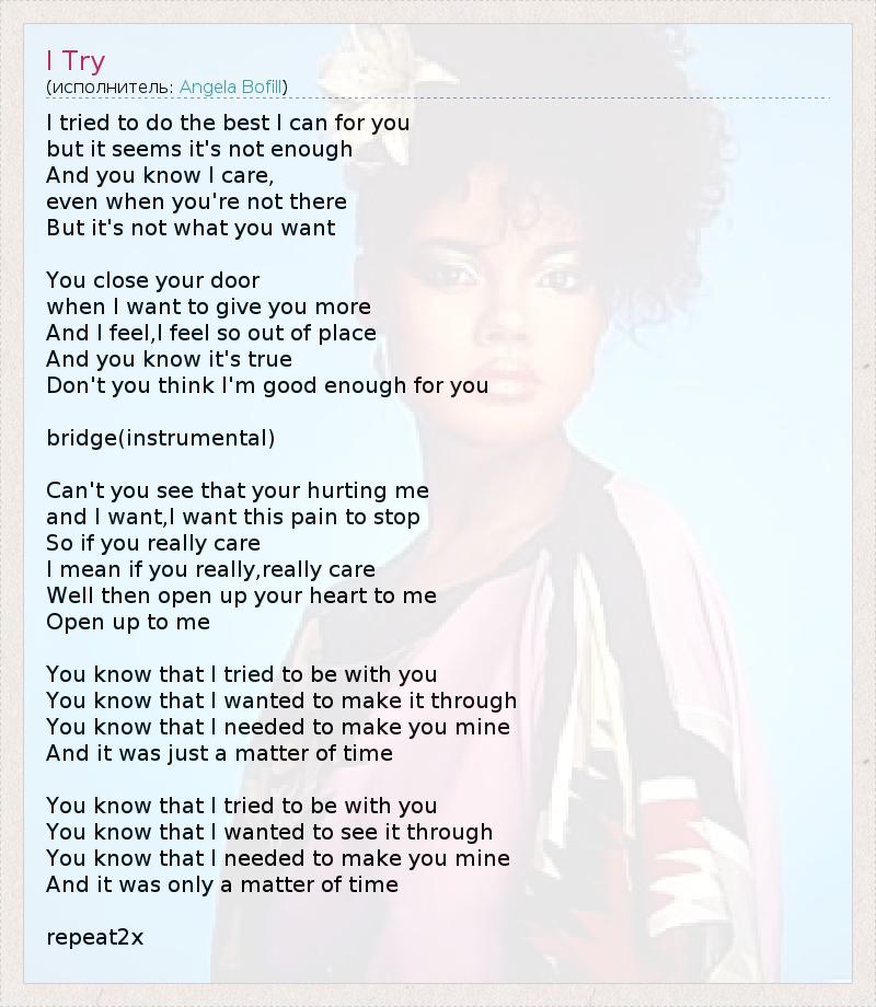 I tried to do the best I can for you but it seems it's not enough And you know I care, even when you're not there But it's not what you want You close your door when I want to give you more And I feel,I feel so out of place And you know it's true Don't you think I'm good enough for you bridge(instrumental) Can't you see that your hurting me and I want,I want this pain to stop So if you really care I mean if you really,really care Well then open up your heart to me Open up to me You know that I tried to be with you You know that I wanted to make it through You know that I needed to make you mine And it was just a matter of time You know that I tried to be with you You know that I wanted to see it through You know that I needed to make you mine And it was only a matter of time repeat2x