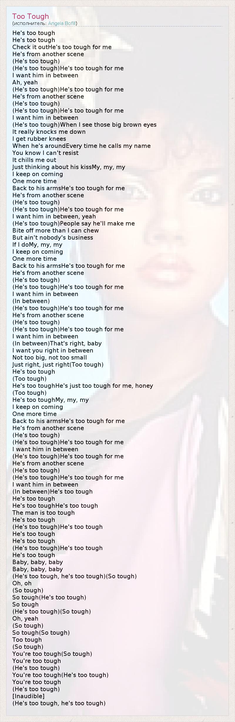 Это интересно:Энджела Бофилл - Американская R&B певица и писательница (дата рождения 2 мая, 1954 год, в Бронксе)Дискография:01. Angie – 1978 02. Angel of the Night – 1979 03. Something About You – 1981 04. Too Tough – 198305. Teaser – 198306. Let Me Be the One – 198407. Tell Me Tomorrow – 198508. Intuition – 198809. I Wanna Love Somebody – 199310. Love in Slow Motion – 1996