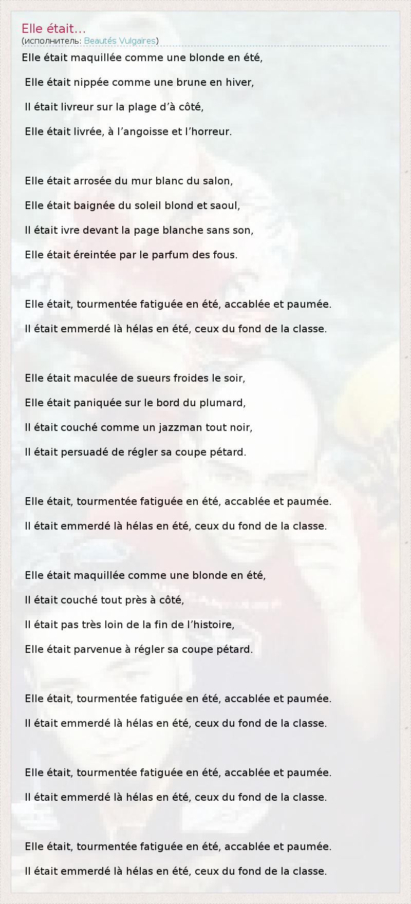 Elle était maquillée comme une blonde en été, Elle était nippée comme une brune en hiver, Il était livreur sur la plage d’à côté, Elle était livrée, à l’angoisse et l’horreur. Elle était arrosée du mur blanc du salon, Elle était baignée du soleil blond et saoul, Il était ivre devant la page blanche sans son, Elle était éreintée par le parfum des fous. Elle était, tourmentée fatiguée en été, accablée et paumée. Il était emmerdé là hélas en été, ceux du fond de la classe. Elle était maculée de sueurs froides le soir, Elle était paniquée sur le bord du plumard, Il était couché comme un jazzman tout noir, Il était persuadé de régler sa coupe pétard. Elle était, tourmentée fatiguée en été, accablée et paumée. Il était emmerdé là hélas en été, ceux du fond de la classe. Elle était maquillée comme une blonde en été, Il était couché tout près à côté, Il était pas très loin de la fin de l’histoire, Elle était parvenue à régler sa coupe pétard. Elle était, tourmentée fatiguée en été, accablée et paumée. Il était emmerdé là hélas en été, ceux du fond de la classe. Elle était, tourmentée fatiguée en été, accablée et paumée. Il était emmerdé là hélas en été, ceux du fond de la classe. Elle était, tourmentée fatiguée en été, accablée et paumée. Il était emmerdé là hélas en été, ceux du fond de la classe.